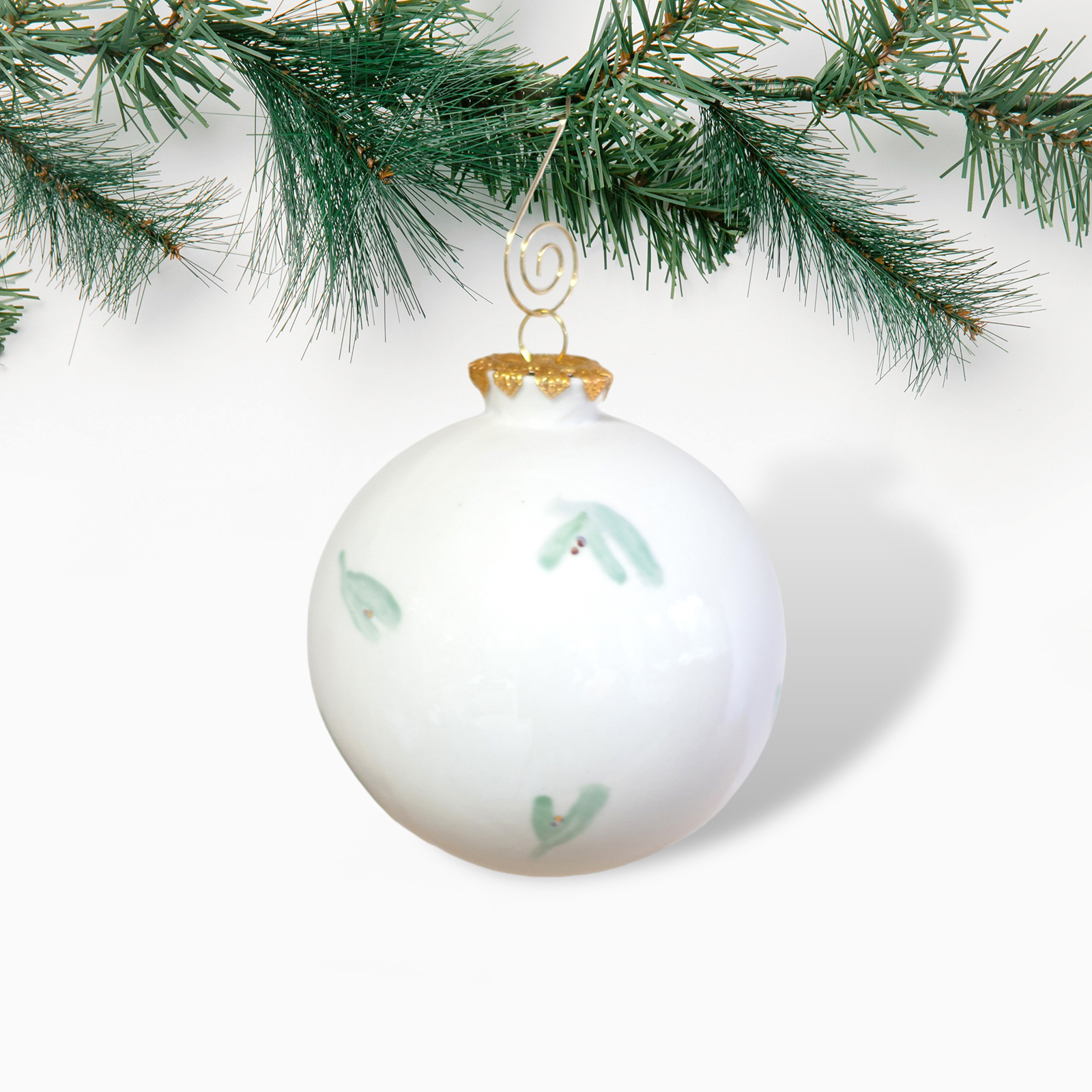 - Elegancka bombka choinkowa o sporych wymiarach. Odlana z białej masy lejnej oraz dekorowana białym szkliwem. Po proszkliwieniu malowana ręcznie farbami naszkliwnymi.