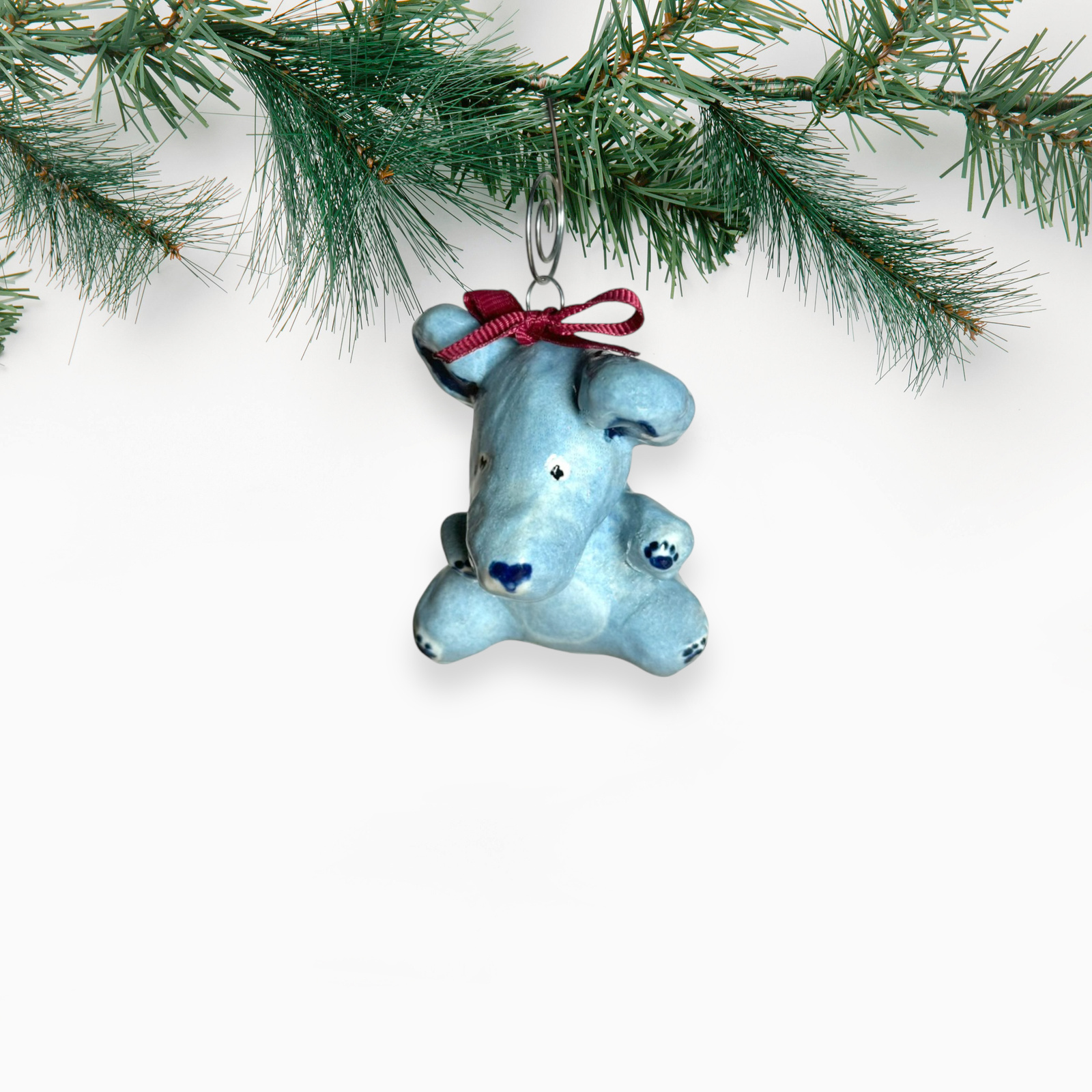 - Elegancka bombka choinkowa w kształcie błękitnej myszki. Odlana metodą autorską z białej masy lejnej. Dekorowana angobami oraz błyszczącym, transparentnym szkliwem.