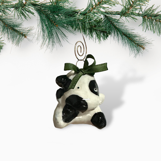 - Elegancka bombka choinkowa w kształcie białej krówki w czarne łaty. Odlana metodą autorską z białej masy lejnej. Dekorowana angobami oraz błyszczącym, transparentnym szkliwem.