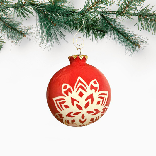 - Elegancka bombka choinkowa o sporych wymiarach. Odlana z białej masy lejnej oraz dekorowana czerwonym dekorem oraz błyszczącym szkliwem.