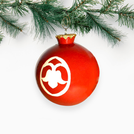 Odlana z białej masy lejnej, dekorowana czerwoną angobą oraz wycinanką z motywem kwiatowym. Pokryta w całości błyszczącym szkliwem. W komplecie wyposażona w złotą zawieszkę oraz dekoracyjny haczyk.