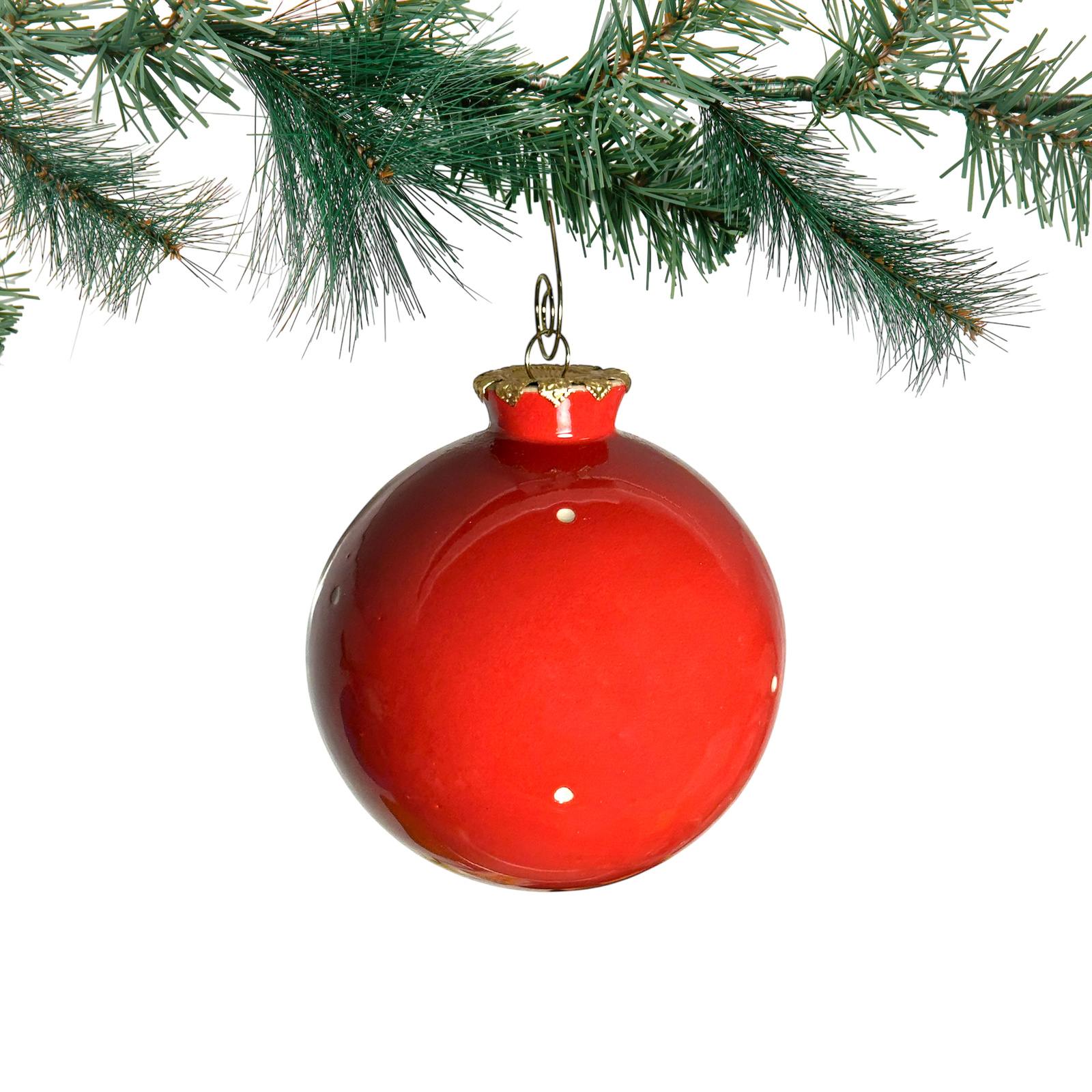 - Elegancka bombka choinkowa o sporych wymiarach. Odlana z białej masy lejnej oraz dekorowana czerwoną angobą i transparentnym szkliwem. Kropeczki wycięte w angobie techniką sgraffito.