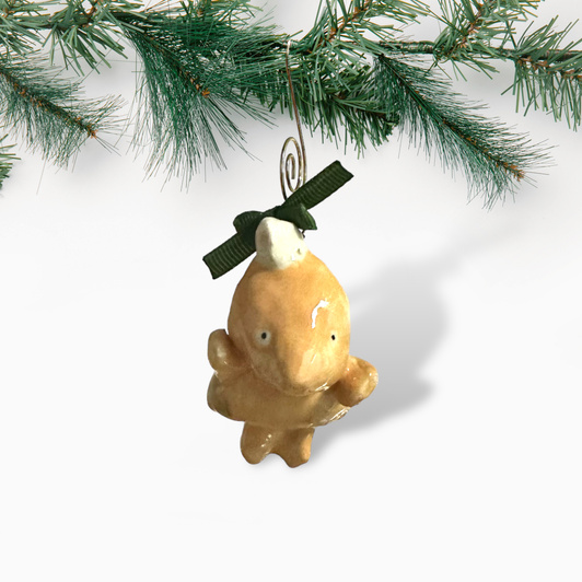 - Elegancka bombka choinkowa w kształcie żółtego kurczaczka. Odlana metodą autorską z białej masy lejnej. Dekorowana angobami oraz błyszczącym, transparentnym szkliwem.