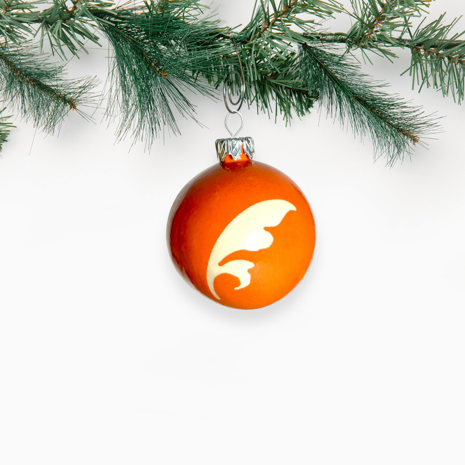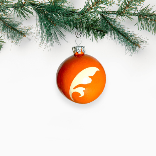- Elegancka bombka choinkowa o niewielkich wymiarach. Odlana z białej masy lejnej, dekorowana pomarańczową angobą oraz wycinanką w kształcie ornamentu roślinnego. Pokryta transparentnym szkliwem.