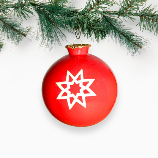 Odlana z białej masy lejnej, dekorowana malinową angobą oraz wycinanką w kształcie gwiazdek. Pokryta w całości błyszczącym szkliwem. W komplecie wyposażona w złotą zawieszkę oraz dekoracyjny haczyk.