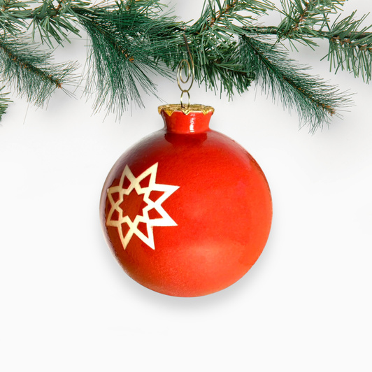 Odlana z białej masy lejnej, dekorowana malinową angobą oraz wycinanką w gwiazdki. Pokryta w całości błyszczącym szkliwem. W komplecie wyposażona w złotą zawieszkę oraz dekoracyjny haczyk.