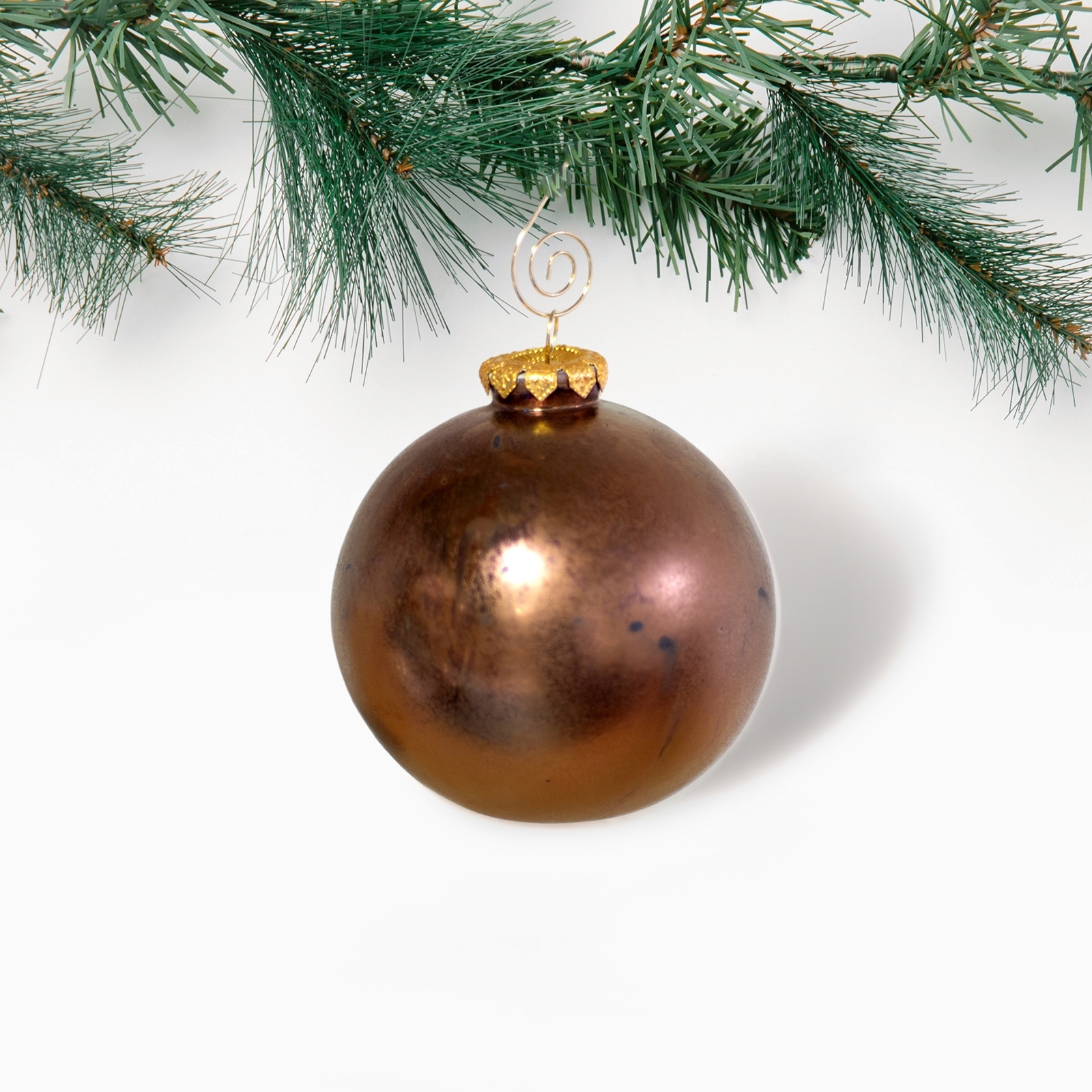 - Elegancka bombka choinkowa o sporych wymiarach. Odlana z białej masy lejnej oraz dekorowana satynowym, miedzianym szkliwem. Po poszkliwieniu malowana ręcznie lustrem.