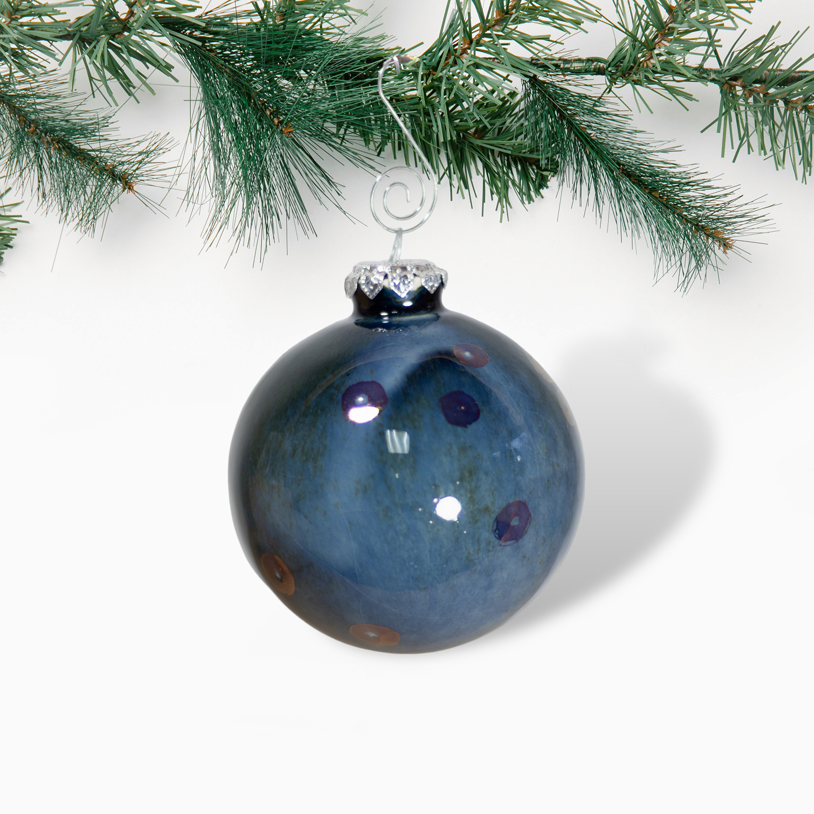 - Elegancka bombka choinkowa o sporych wymiarach. Odlana z białej masy lejnej oraz dekorowana błyszczącym, granatowym szkliwem. Po poszkliwieniu malowana ręcznie lustrem oraz farbami naszkliwnymi.