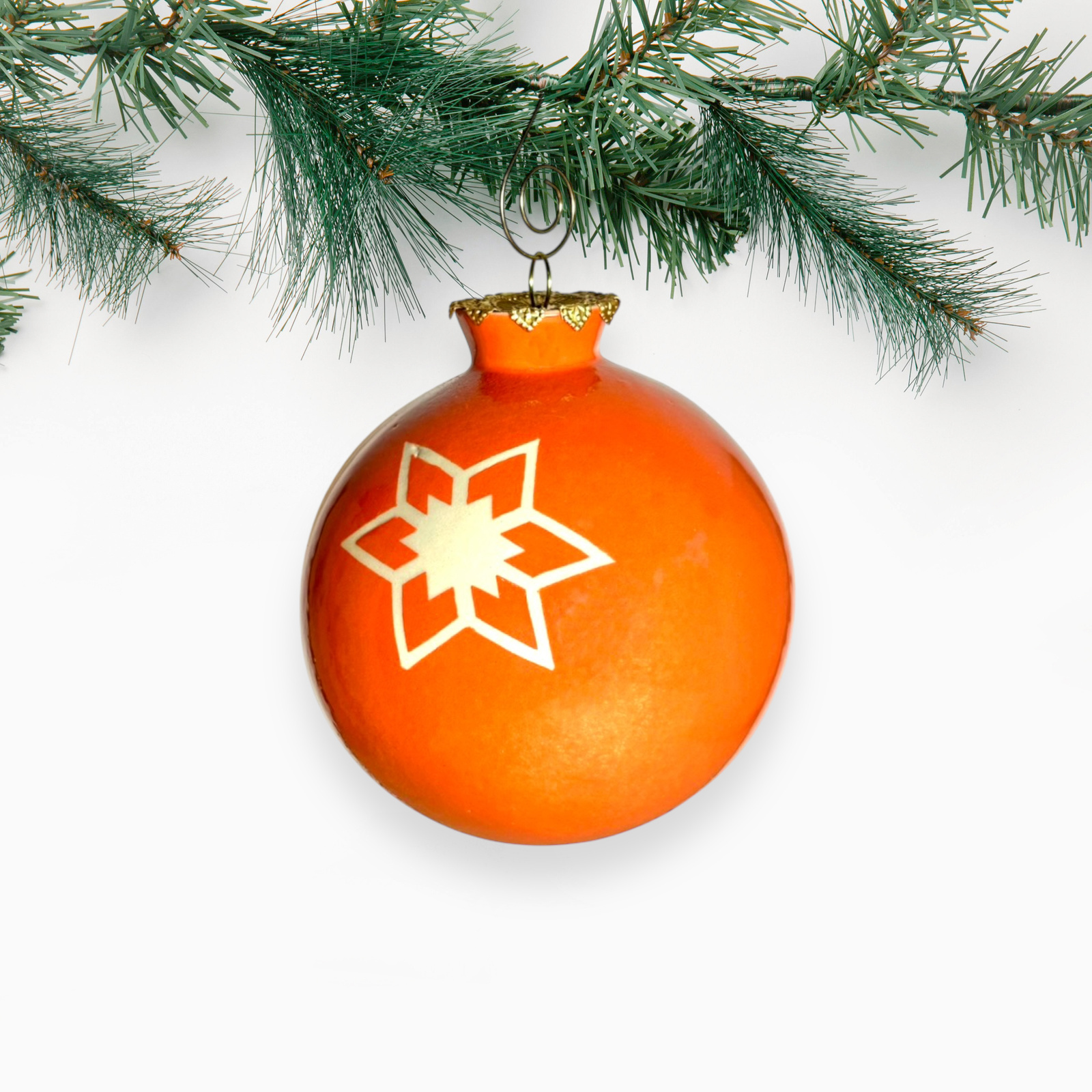 - Elegancka bombka choinkowa o sporych wymiarach. Odlana z białej masy lejnej, dekorowana pomarańczową angobą oraz wycinanką w gwiazdki. Pokryta transparentnym szkliwem.
