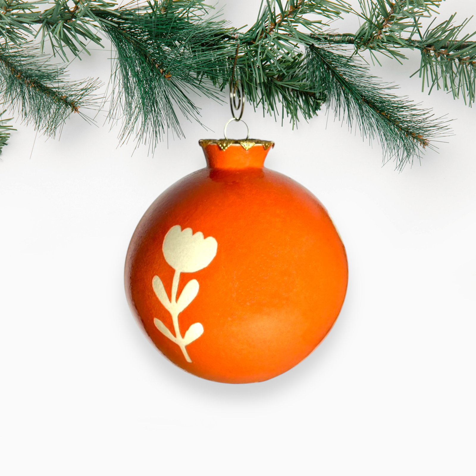 - Elegancka bombka choinkowa o sporych wymiarach. Odlana z białej masy lejnej, dekorowana pomarańczową angobą oraz wycinanką w kwiaty. Pokryta transparentnym szkliwem.