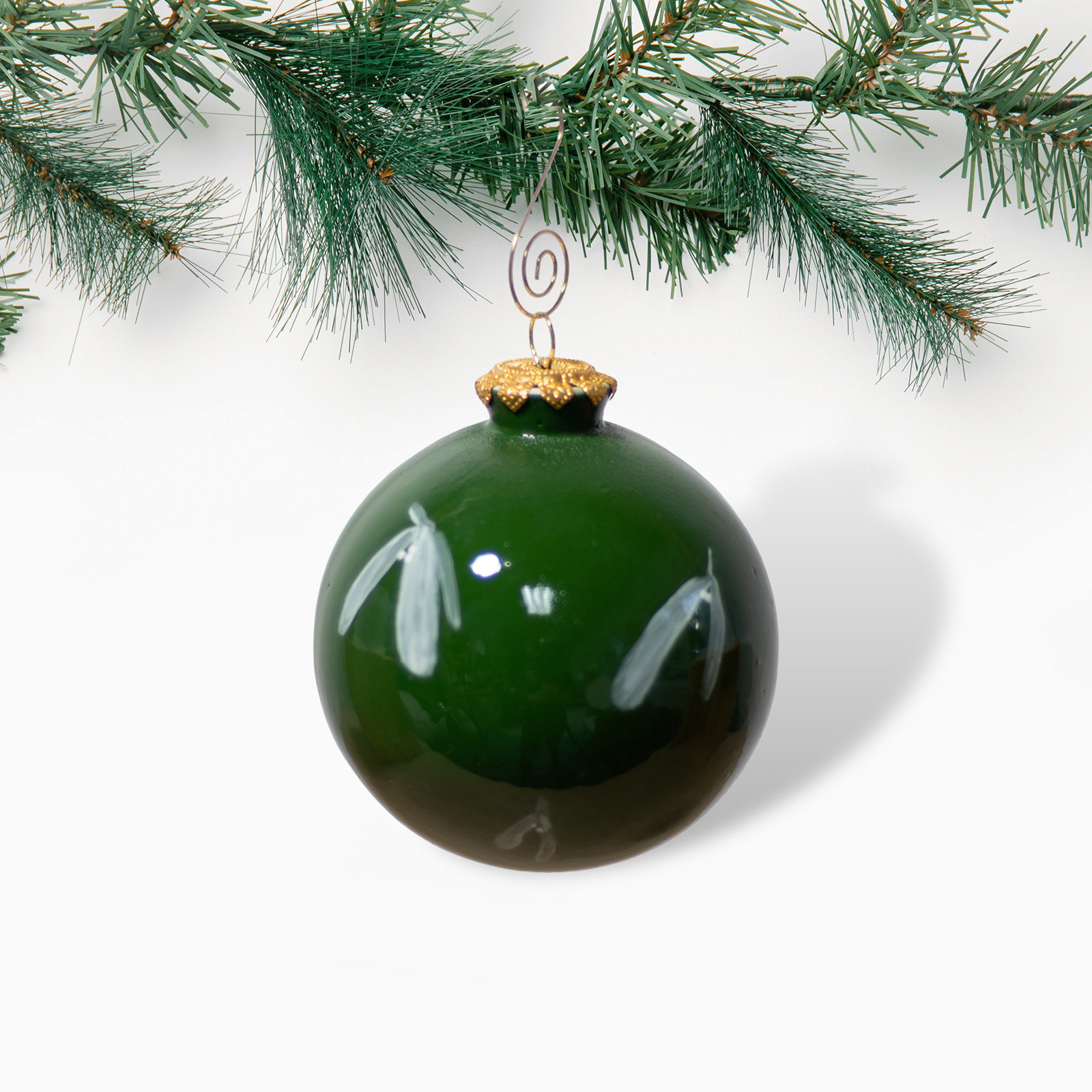 - Elegancka bombka choinkowa o sporych wymiarach. Odlana z białej masy lejnej oraz dekorowana zieloną angobą i transparentnym szkliwem. Po poszkliwieniu malowana ręcznie farbami naszkliwnymi.