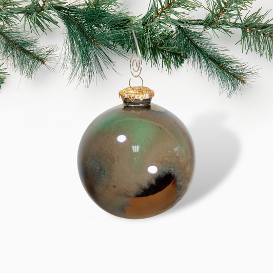 - Elegancka bombka choinkowa o sporych wymiarach. Odlana z białej masy lejnej oraz dekorowana błyszczącym szkliwem o wielu odcieniach zieleni. Po poszkliwieniu dodatkowo malowana ręcznie lustrem.