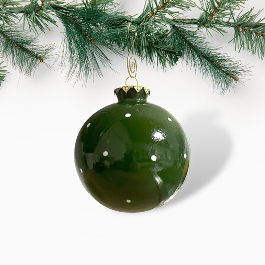 - Elegancka bombka choinkowa o sporych wymiarach. Odlana z białej masy lejnej oraz dekorowana zieloną angobą oraz błyszczącym, transparentnym szkliwem. Po poszkliwieniu malowana ręcznie farbą naszkliwną.