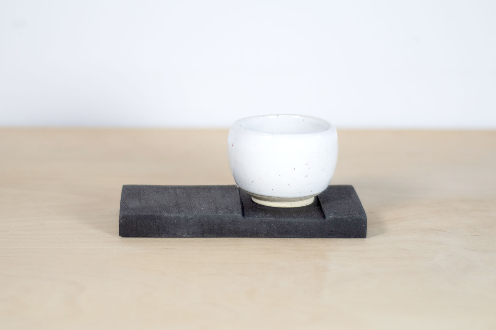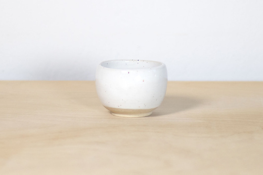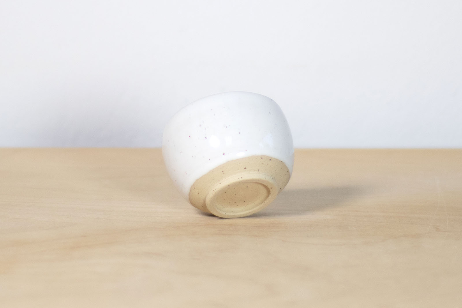 - Czarka do espresso o pojemności 100 ml. Wykonana ręcznie na kole garncarskim. Masa w kolorze kremowym w cętki. W całości pokryta białym, błyszczącym szkliwem.