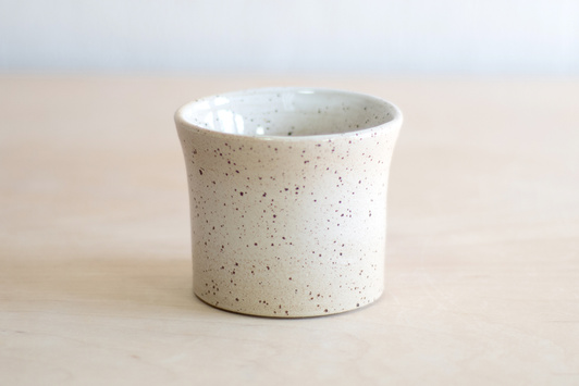 • Czarka ceramiczna o pojemności 200 ml. Wykonana ręcznie na kole garncarskim. Masa w kolorze kremowym w cętki. Pokryta w całości białym błyszczącym, półprzezroczystym szkliwem.