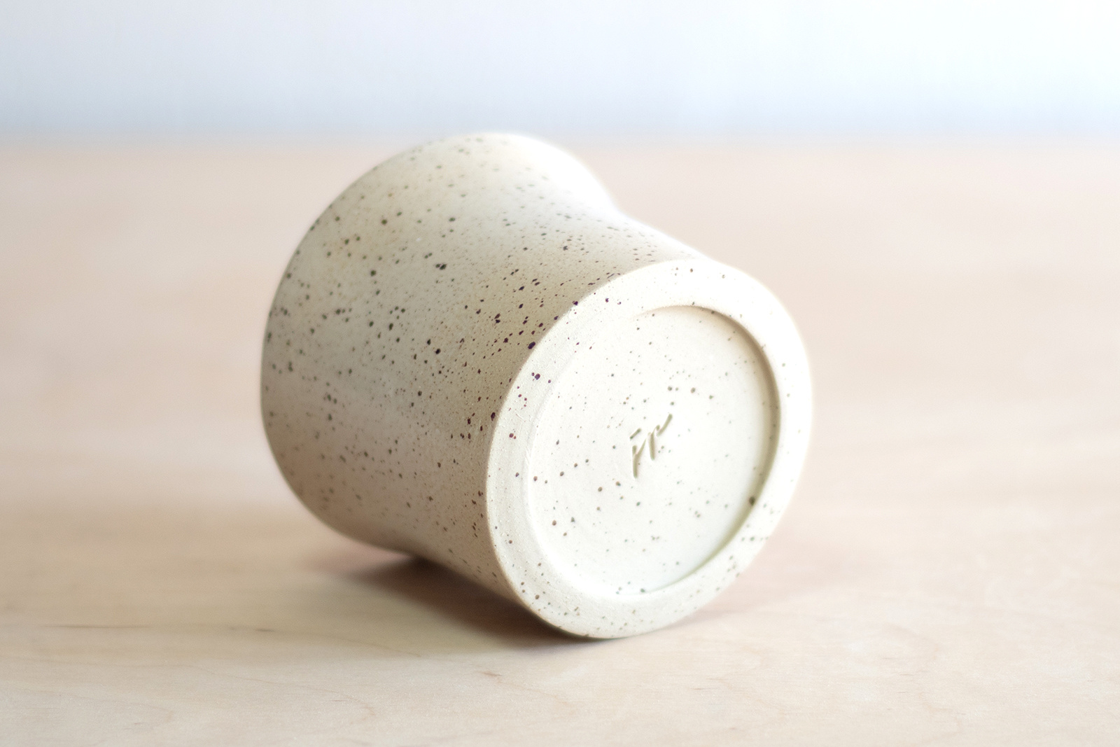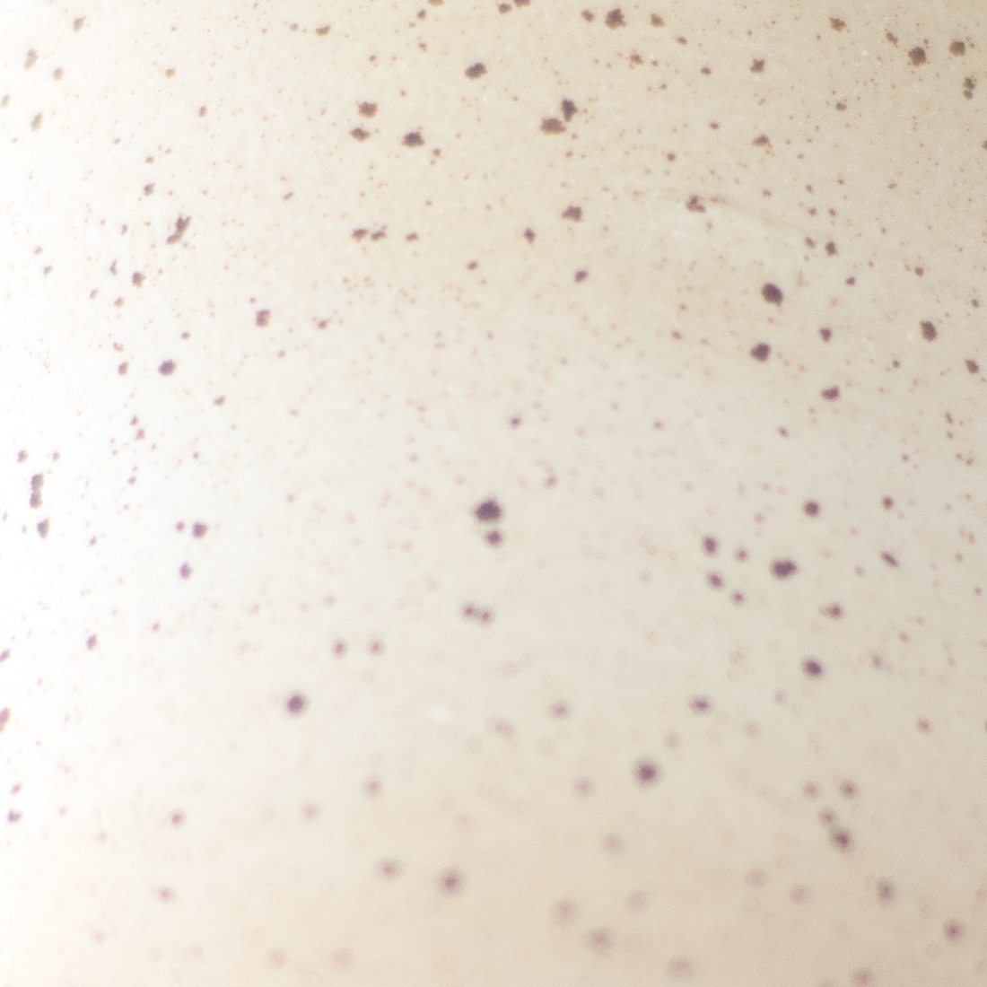 Wykonana ręcznie na kole garncarskim gliny w kolorze kremowym w brązowe cętki. Stopka wycięta ręcznie. Sygnowana stemplem z logo autorki. W całości pokryta białym błyszczącym, półprzezroczystym szkliwem.