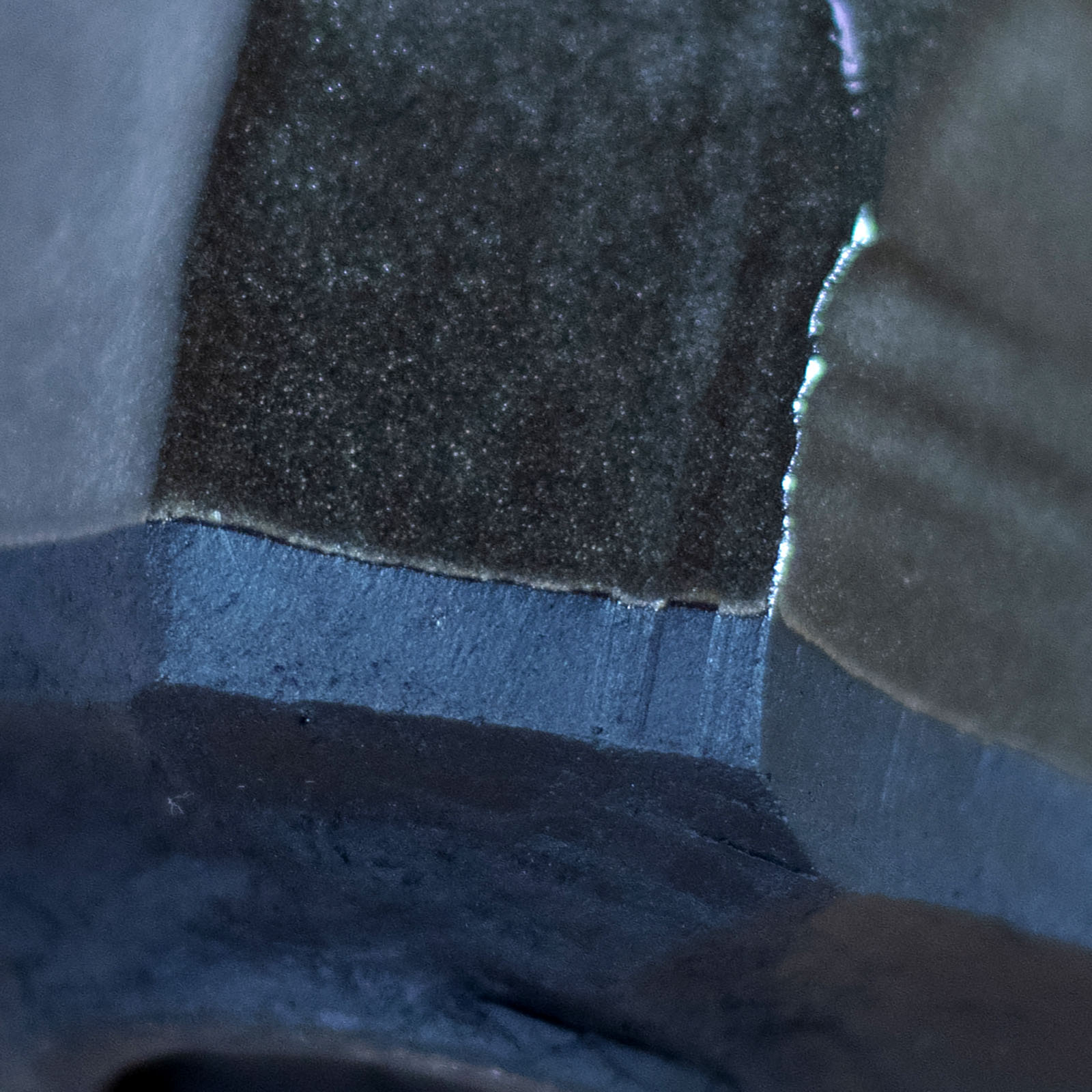 Wykonana ręcznie na kole garncarskim gliny w kolorze czarnym. Struktura na zewnątrz wycięta ręcznie. Pokryta wewnątrz i częściowo również na zewnątrz szkliwem o błyszczącej, białej półprzezroczystej barwie.