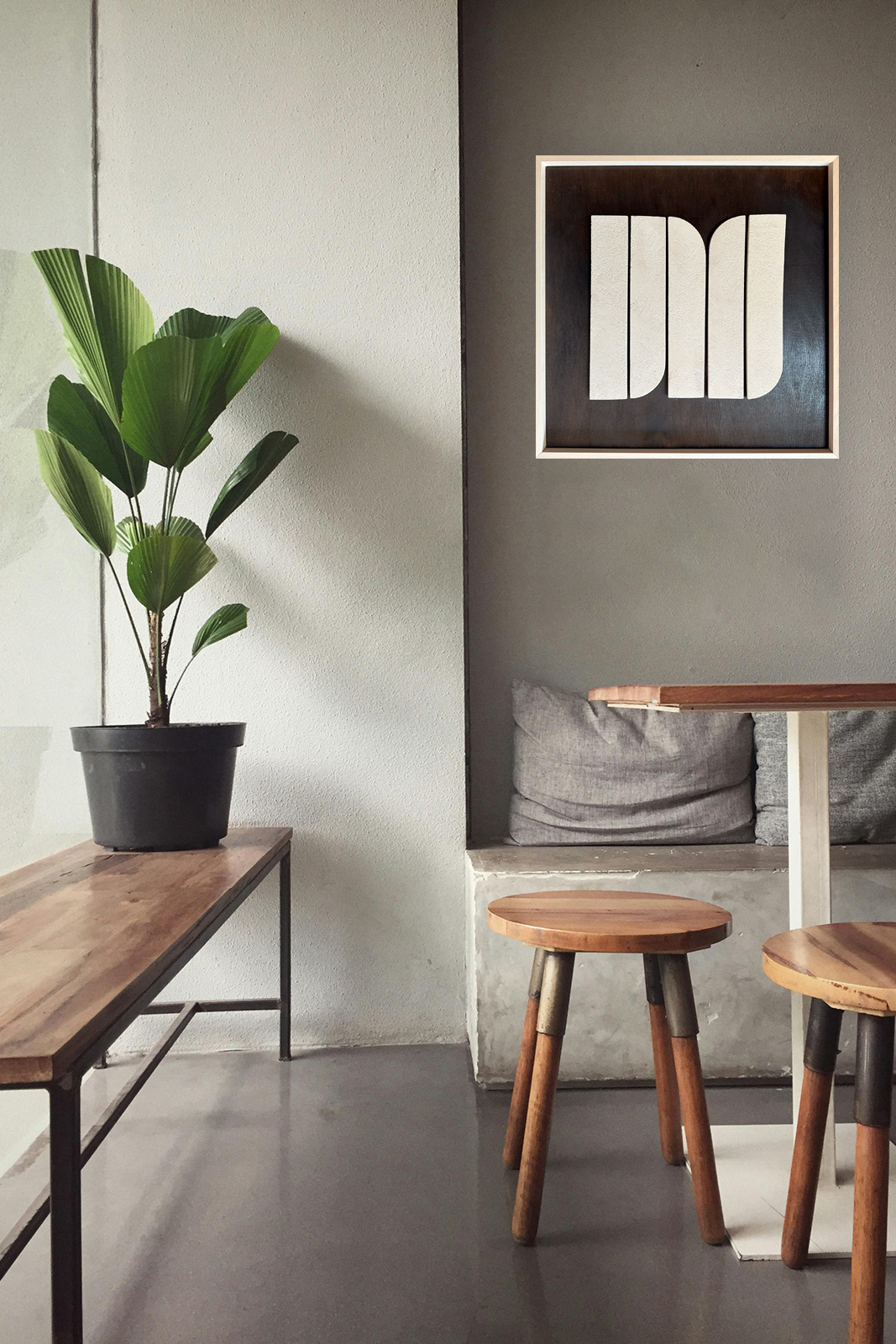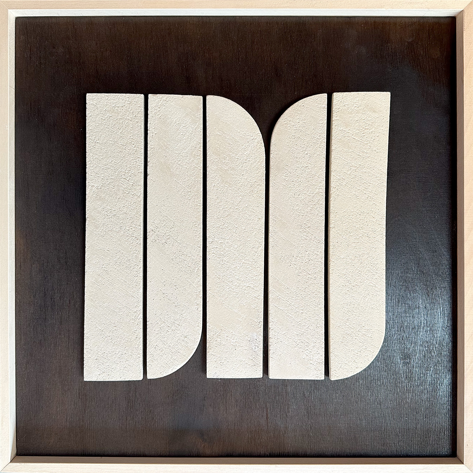 - Dekor ścienny, będący kombinacją elementów wykonanych z ceramiki, ułożonych w abtrakcyjną kompozycję. Jasne kafle o szorstkim wykończeniu powierzchni, oprawione w ciemną deskę w tle oraz naturalną drewnianą ramę.