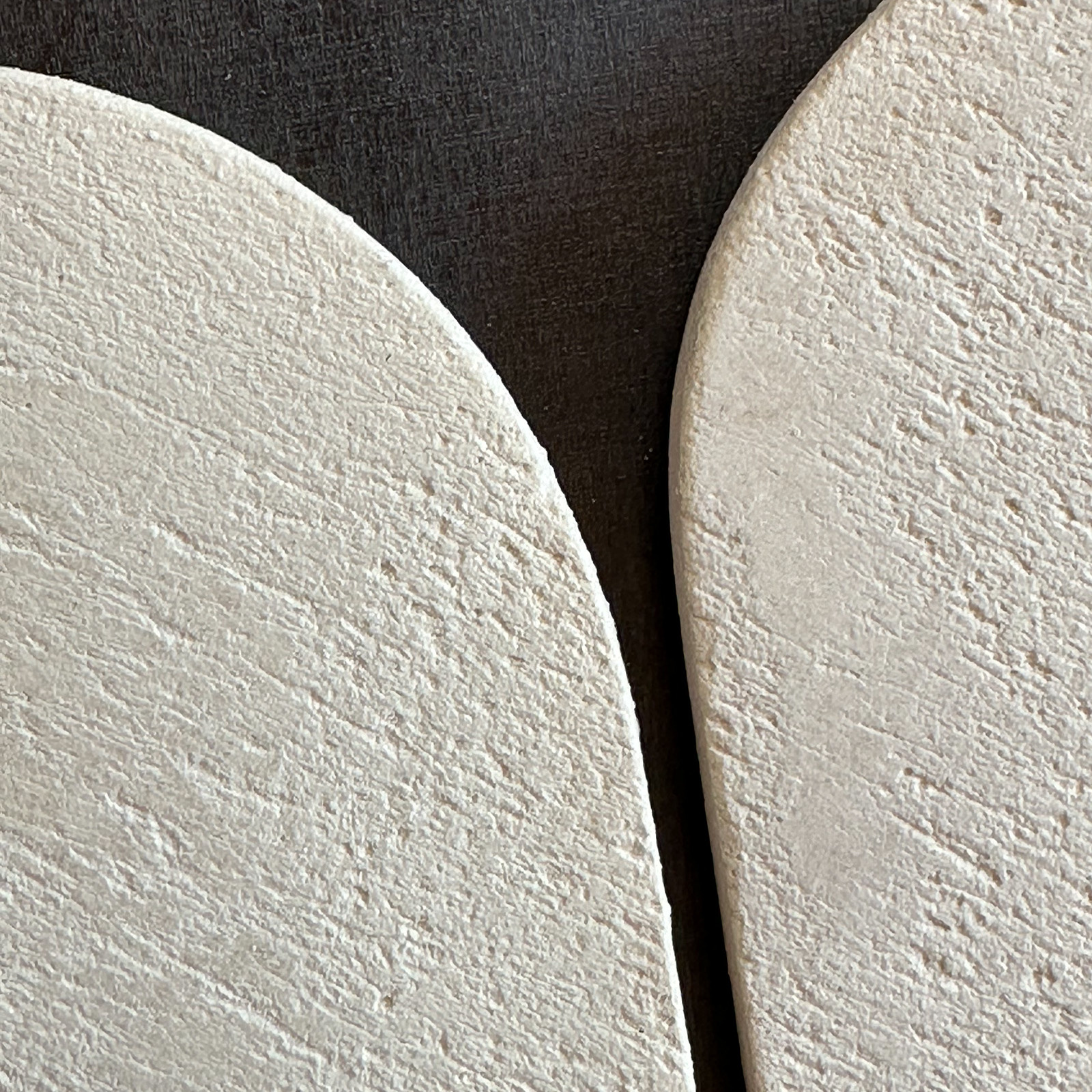 Wykonana ręcznie z gliny w kolorze kremowym. Jasne kafle o szorstkim wykończeniu powierzchni, oprawione w ciemną deskę w tle oraz naturalną drewnianą ramę.