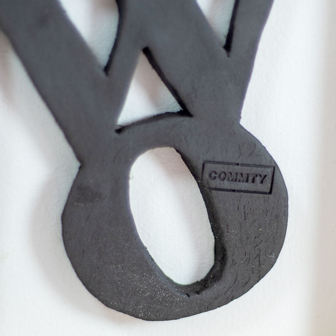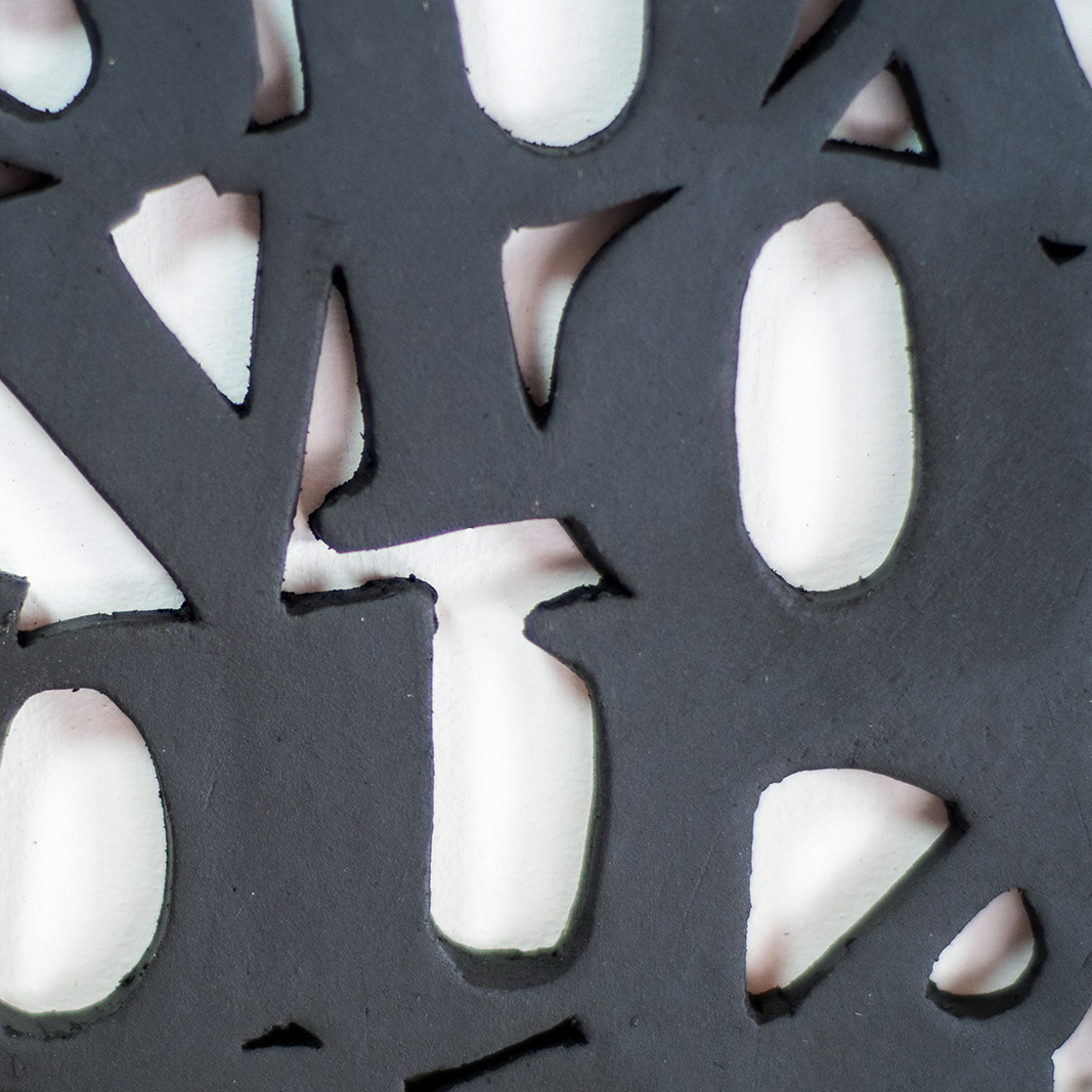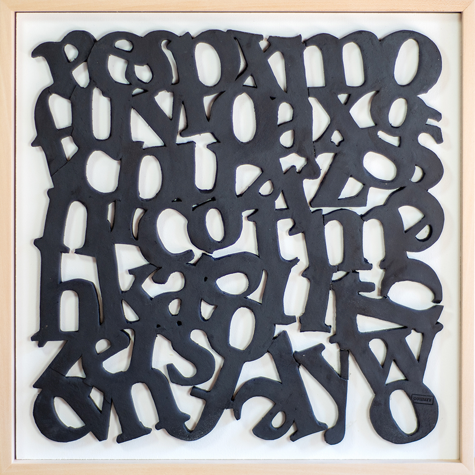 Dekor ścienny, będący kombinacją elementów wykonanych z czarnej ceramiki, ułożonych w abstrakcyjną kompozycję inspirowaną literami alfabetu. Czarne kafle o szorstkim wykończeniu, na białym tle. Oprawione w naturalną drewnianą ramę.