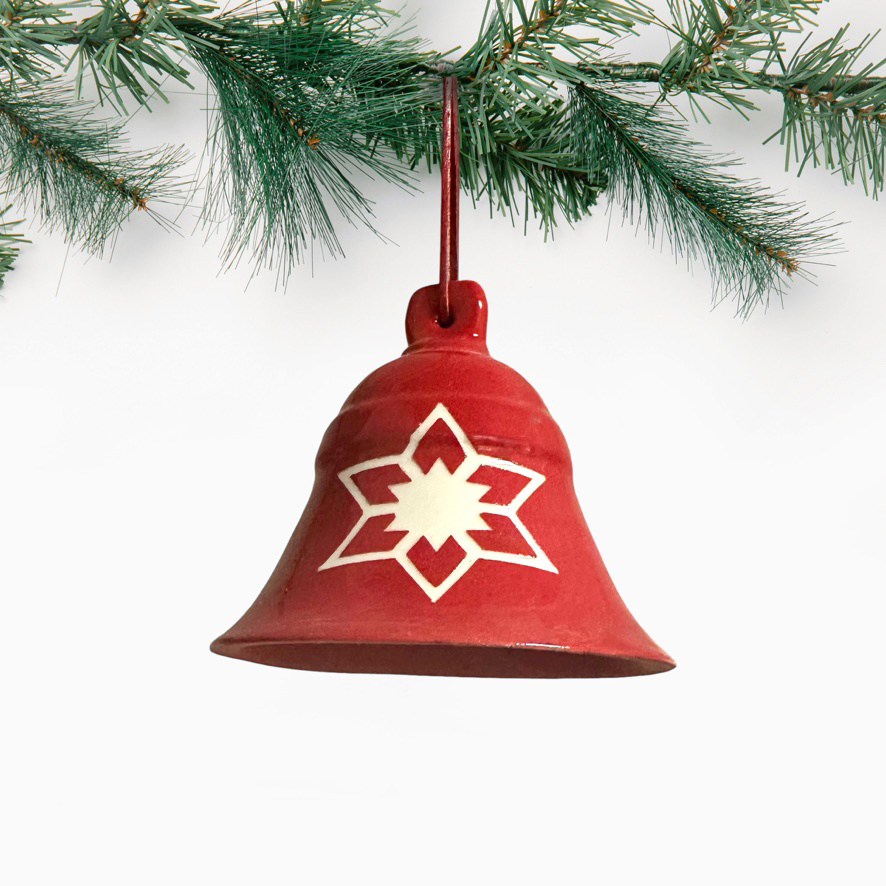 Elegancki dzwonek na choinkę o znacznych wymiarach. Odlany z białej masy lejnej oraz dekorowany czerwonym dekorem oraz błyszczącym szkliwem. W komplecie dekoracyjny rzemyk w dopasowanym kolorze, do powieszenia.
