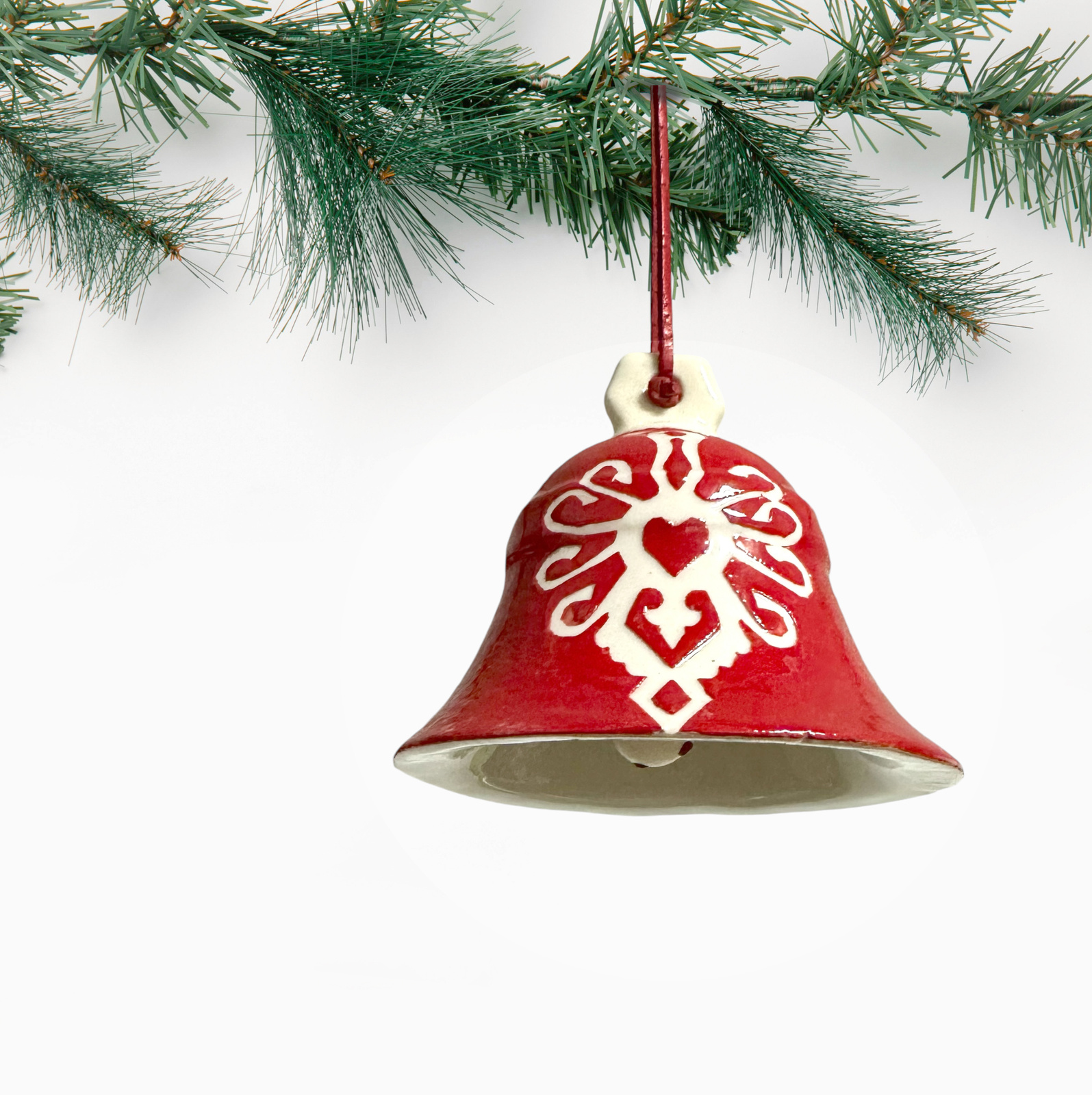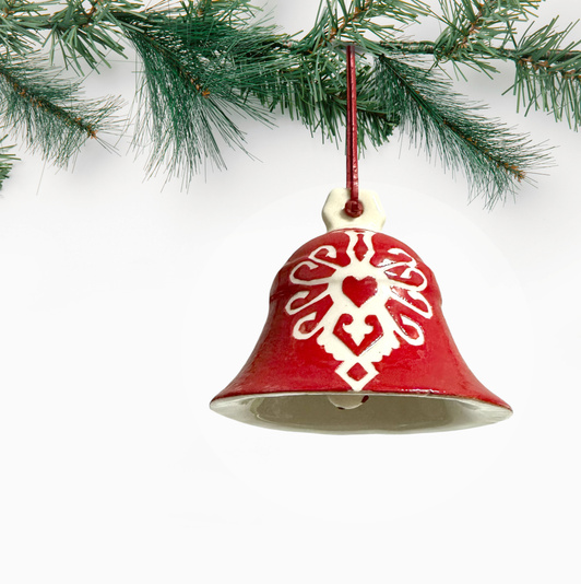 - Elegancki dzwoneczek na choinkę. Odlany z białej masy lejnej oraz dekorowany czerwonym dekorem oraz błyszczącym szkliwem.