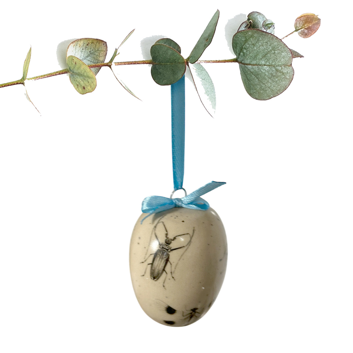 Jajko wielkanocne z błękitną wstążeczką. Biały kwiatek i owady