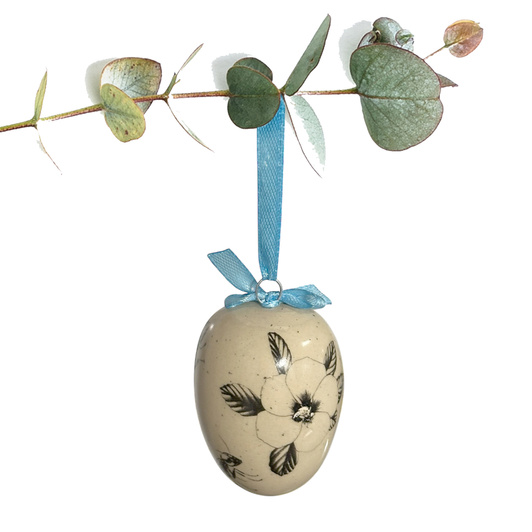 Uformowane ręcznie w formie jajka z masy o kremowej barwie w ciemne cętki. Pokryta w całości błyszczącym szkliwem, następnie dekorowana kalką. W komplecie wyposażona w zawieszkę oraz kokardkę i wstążeczkę w kolorze błękitnym.