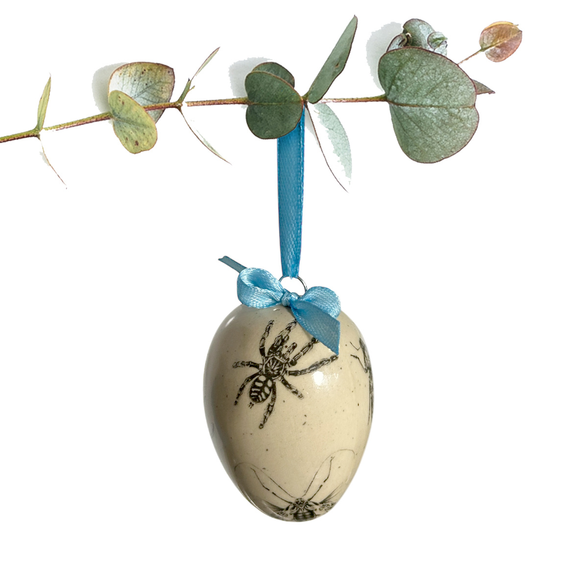 Jajko wielkanocne z błękitną wstążeczką. Pajączek i żuczki.