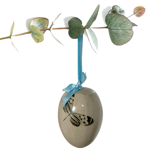 Uformowane ręcznie w formie jajka z masy o kremowej barwie w ciemne cętki. Pokryta w całości błyszczącym szkliwem, następnie dekorowana kalką. W komplecie wyposażona w zawieszkę oraz kokardkę i wstążeczkę w kolorze błękitnym.