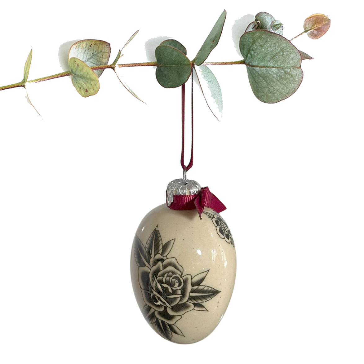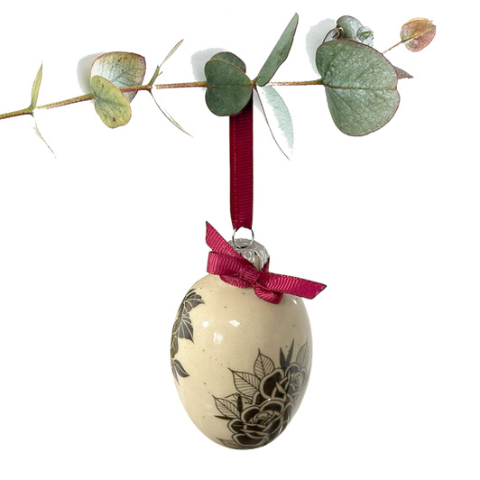 Uformowane ręcznie w formie jajka z masy o kremowej barwie w ciemne cętki. Pokryta w całości błyszczącym szkliwem, następnie dekorowana kalką. W komplecie wyposażona w srebrną zawieszkę oraz kokardkę i wstążeczkę w kolorze bordowym.