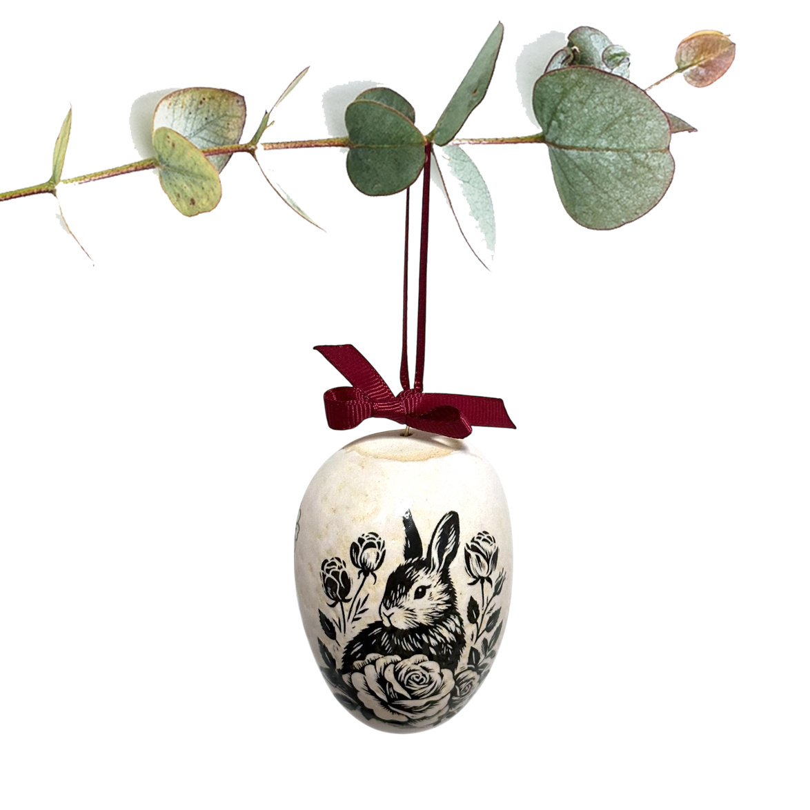 Jajko wielkanocne z bordową wstążeczką. Zając i ptaszek.