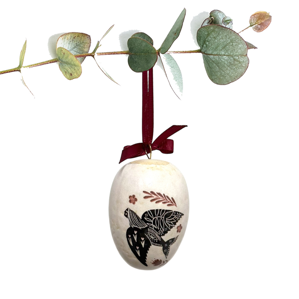 Uformowane ręcznie w formie jajka z masy o kremowej barwie. Pokryta w całości błyszczącym szkliwem, następnie dekorowana kalką. W komplecie wyposażona w zawieszkę oraz kokardkę i wstążeczkę w kolorze bordowym.