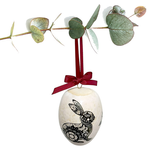 • Jajko wielkanocne wiszące, wykonane ręcznie z masy o kremowej barwie. Dekorowane kaleczką w kolorze czarnym.
