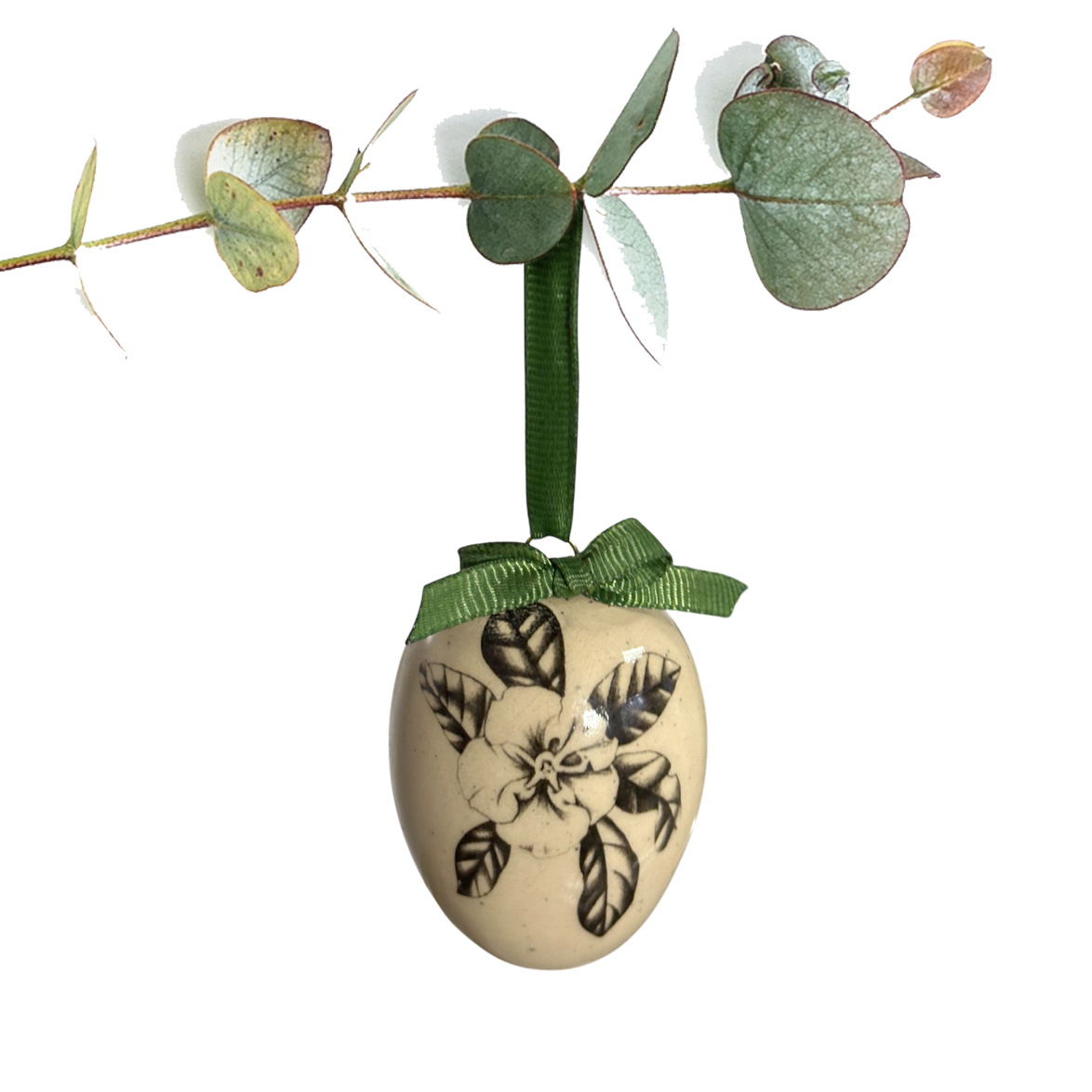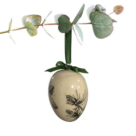 Uformowane ręcznie w formie jajka z masy o kremowej barwie w ciemne cętki. Pokryta w całości błyszczącym szkliwem, następnie dekorowana kalką. W komplecie wyposażona w zawieszkę oraz kokardkę i wstążeczkę w kolorze zielonym.