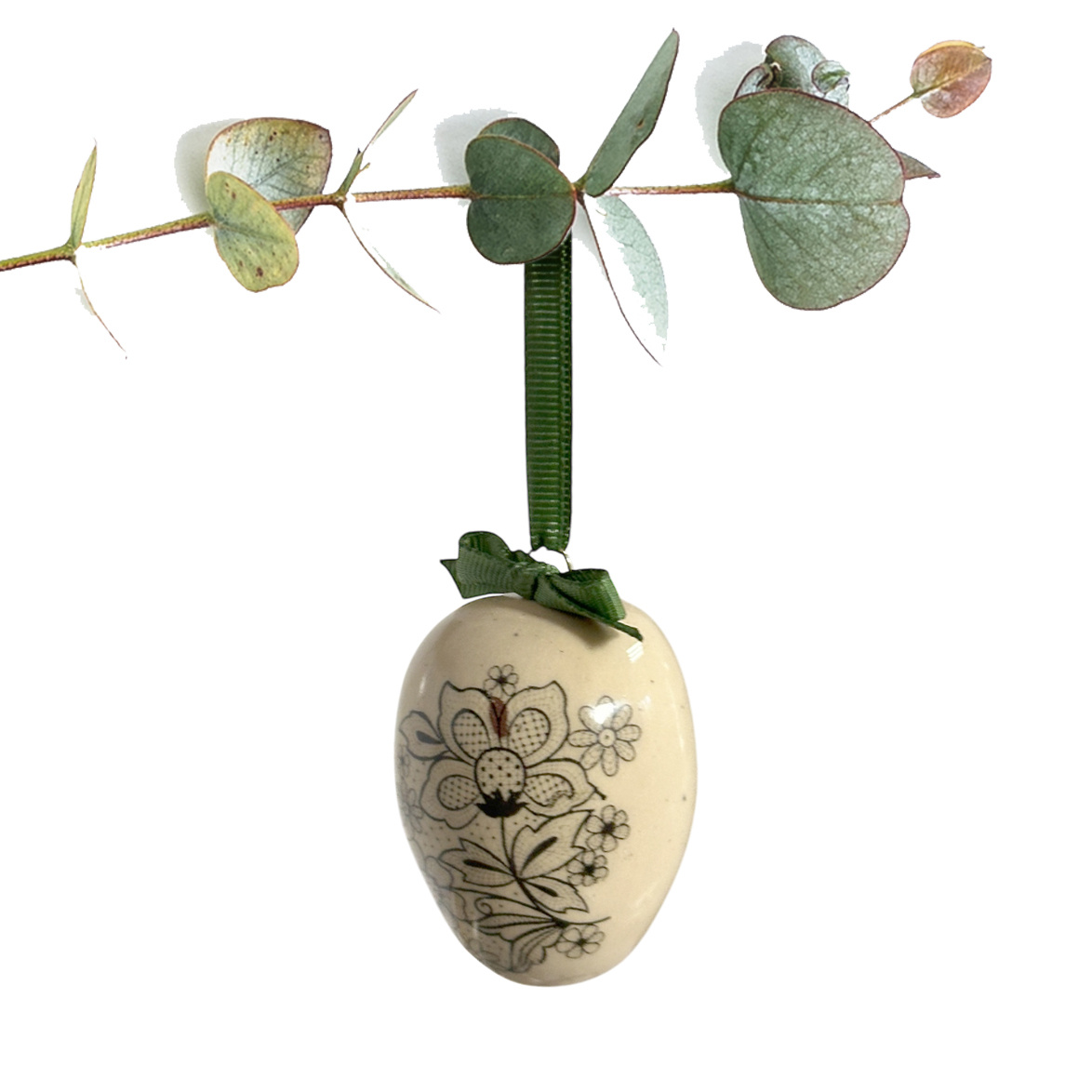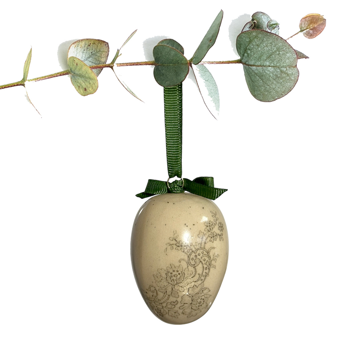 Uformowane ręcznie w formie jajka z masy o kremowej barwie w ciemne cętki. Pokryta w całości błyszczącym szkliwem, następnie dekorowana kalką. W komplecie wyposażona w zawieszkę oraz kokardkę i wstążeczkę w kolorze zielonym.