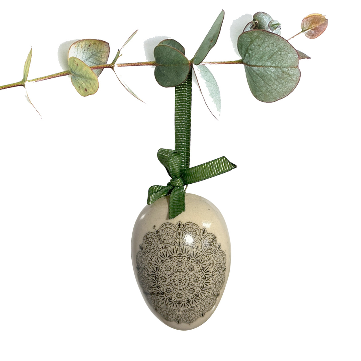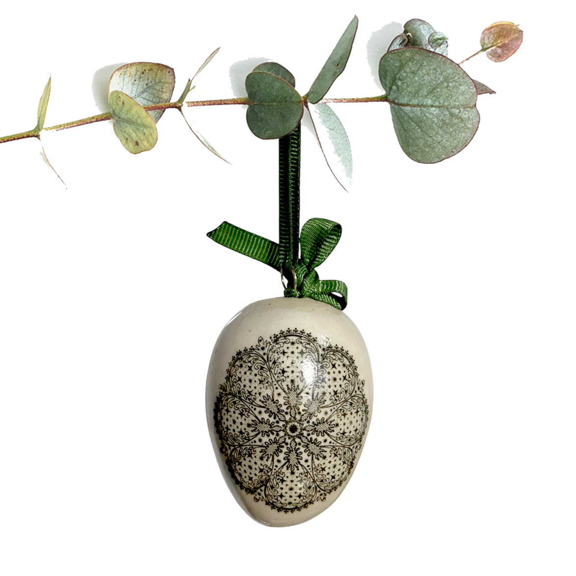 Uformowane ręcznie w formie jajka z masy o kremowej barwie w ciemne cętki. Pokryta w całości błyszczącym szkliwem, następnie dekorowana kalką. W komplecie wyposażona w zawieszkę oraz kokardkę i wstążeczkę w kolorze zielonym.