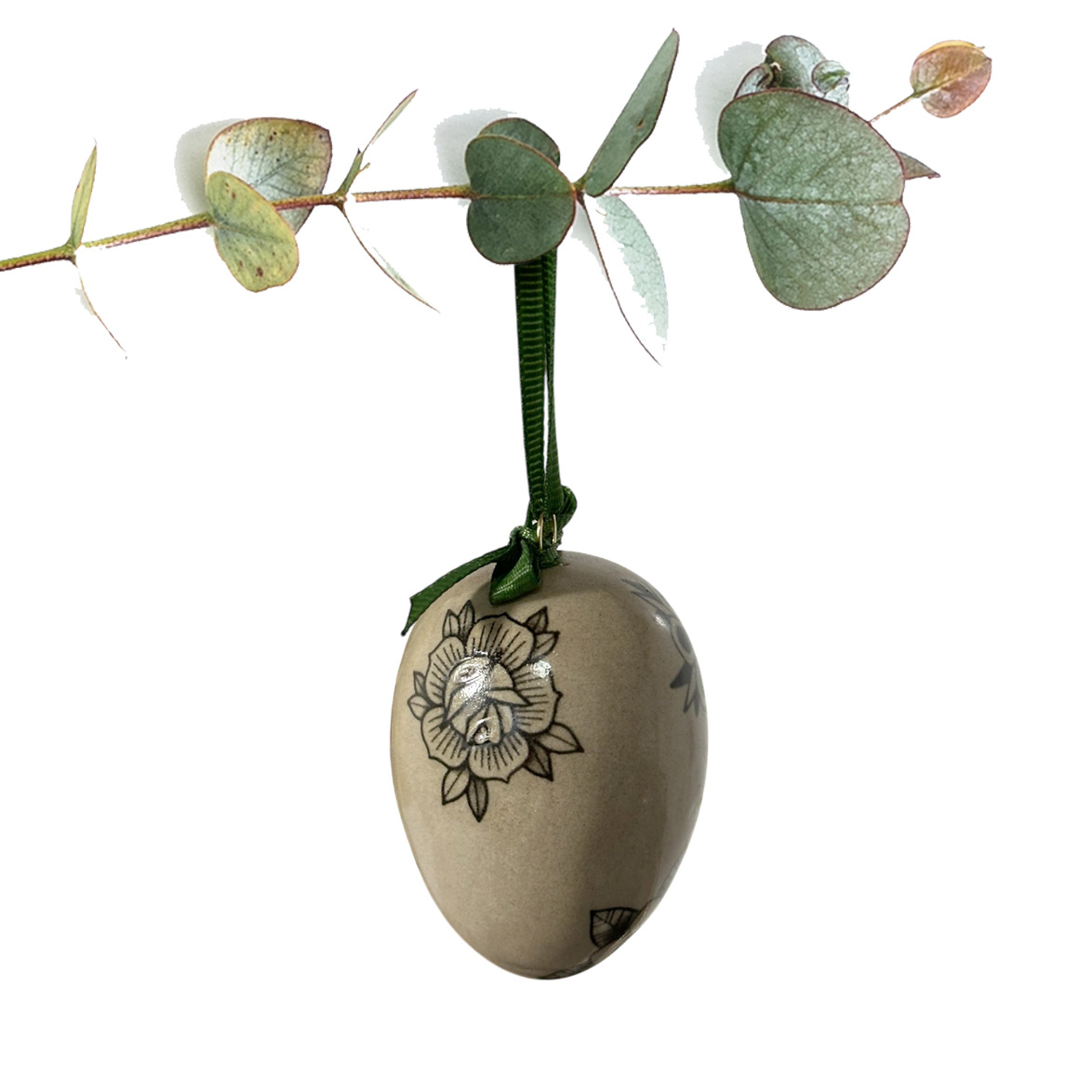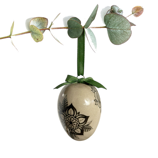 - Jajko wielkanocne wiszące, wykonane ręcznie z masy o beżowej barwie w ciemne centki. Dekorowane kaleczką w kolorze czarnym w kwiaty z tatuaży.