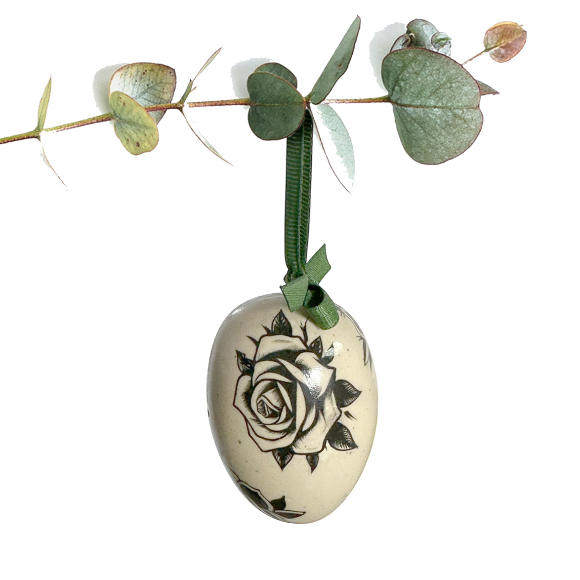 Uformowane ręcznie w formie jajka z masy o beżowej barwie w ciemne cętki. Pokryta w całości błyszczącym szkliwem, następnie dekorowana kalką. W komplecie wyposażona w zawieszkę oraz kokardkę i wstążeczkę w kolorze zielonym.
