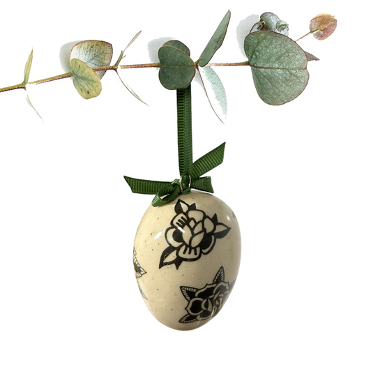 - Jajko wielkanocne wiszące, wykonane ręcznie z masy o kremowej barwie w ciemne centki. Dekorowane czarną kaleczką w kwiaty z tatuaży.