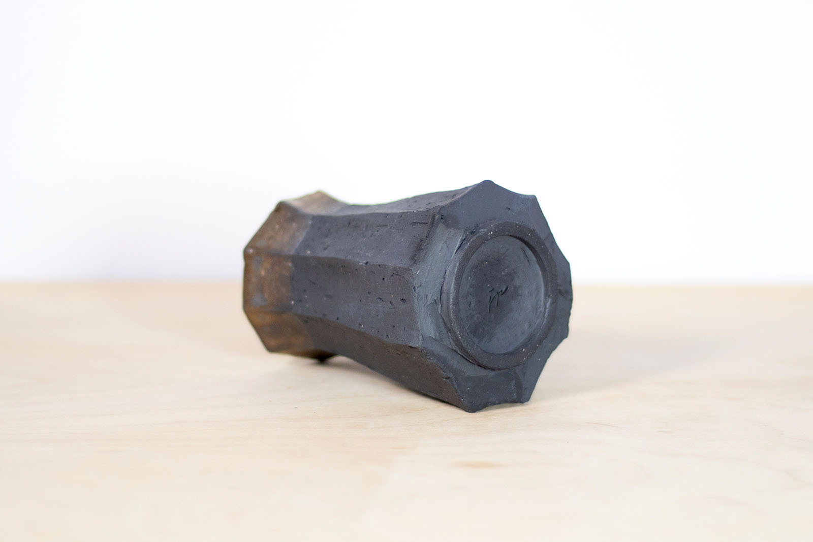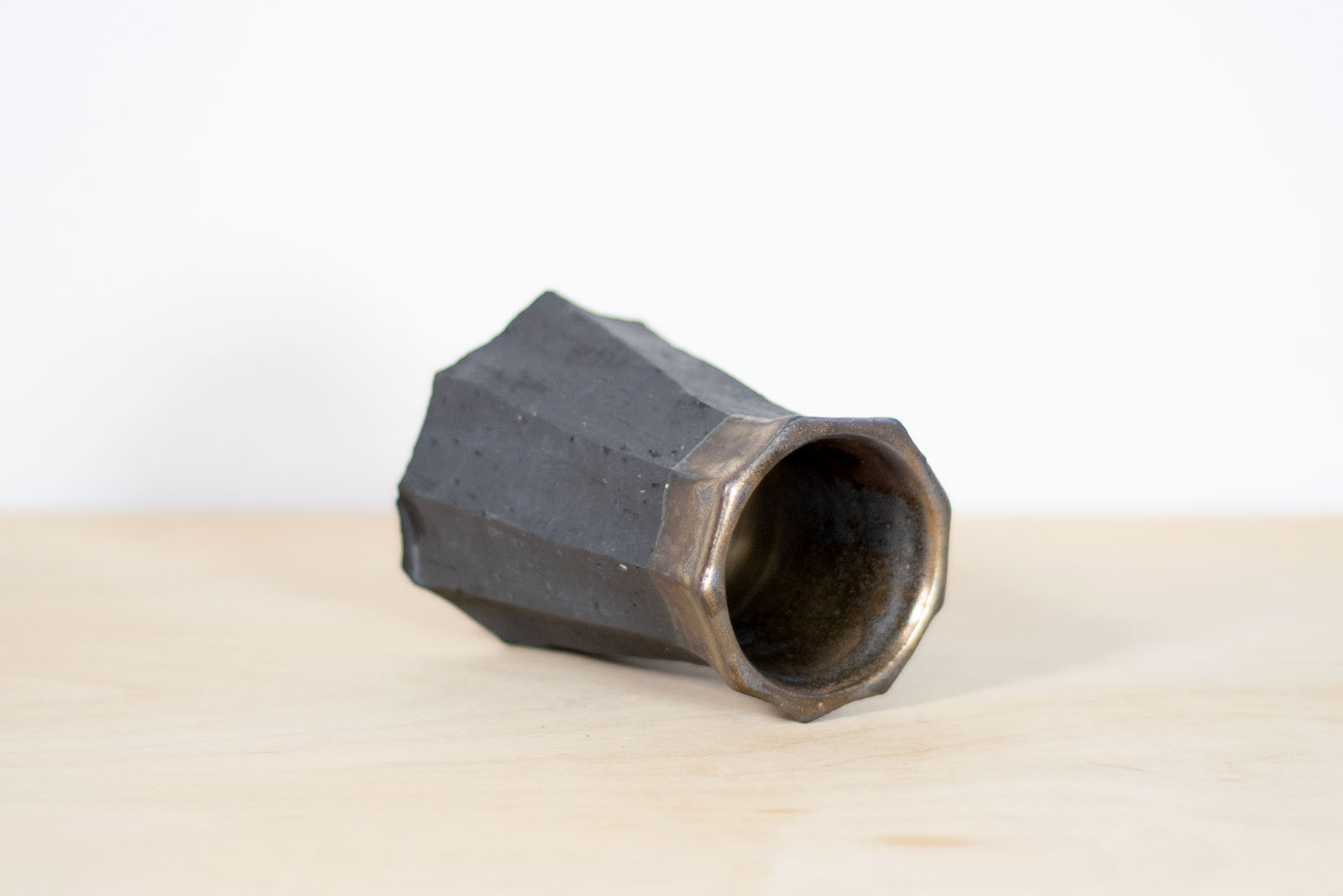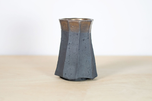 Wykonana ręcznie na kole garncarskim gliny w kolorze czarnym. Struktura na zewnątrz wycięta ręcznie. Pokryta wewnątrz i częściowo również na zewnątrz szkliwem o satynowej powierzchni i miedzianej barwie.