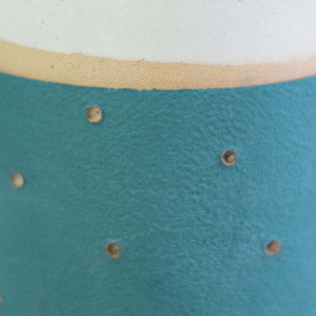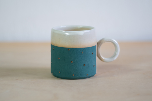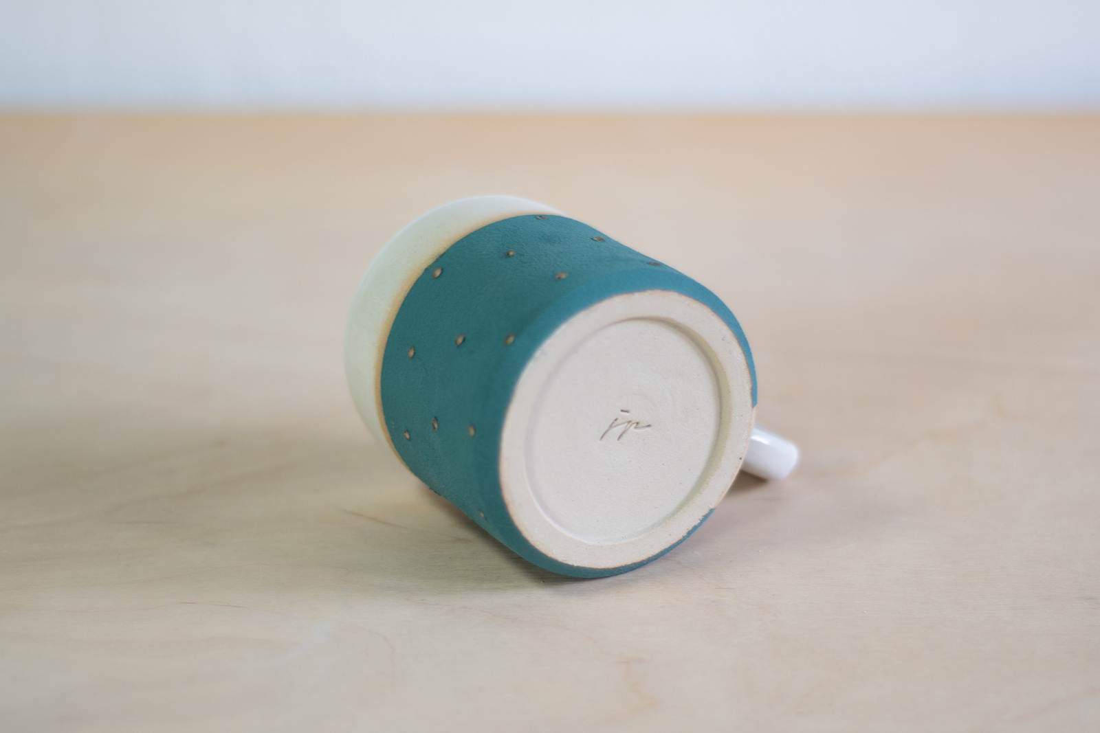 • Kubek ceramiczny o pojemności 175 ml. Wykonany ręcznie na kole garncarskim. Masa w kolorze kremowym. Wewnątrz oraz górnej części pokryty białym, błyszczącym szkliwem. Dolna część kubka pokryta matową, głęboko turkusową angobą w kropeczki.