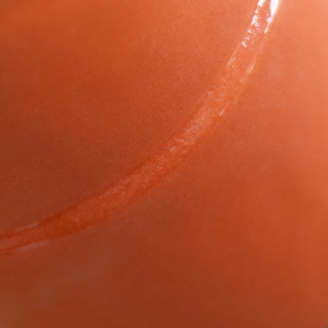 Wykonany ręcznie z masy lejnej na bazie autorskiej formy gipsowej. Masa w kolorze złamanej bieli, pokryta pomarańczową angobą oraz błyszczącym szkliwem.