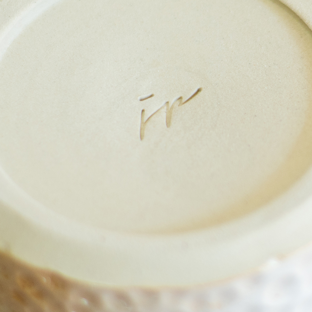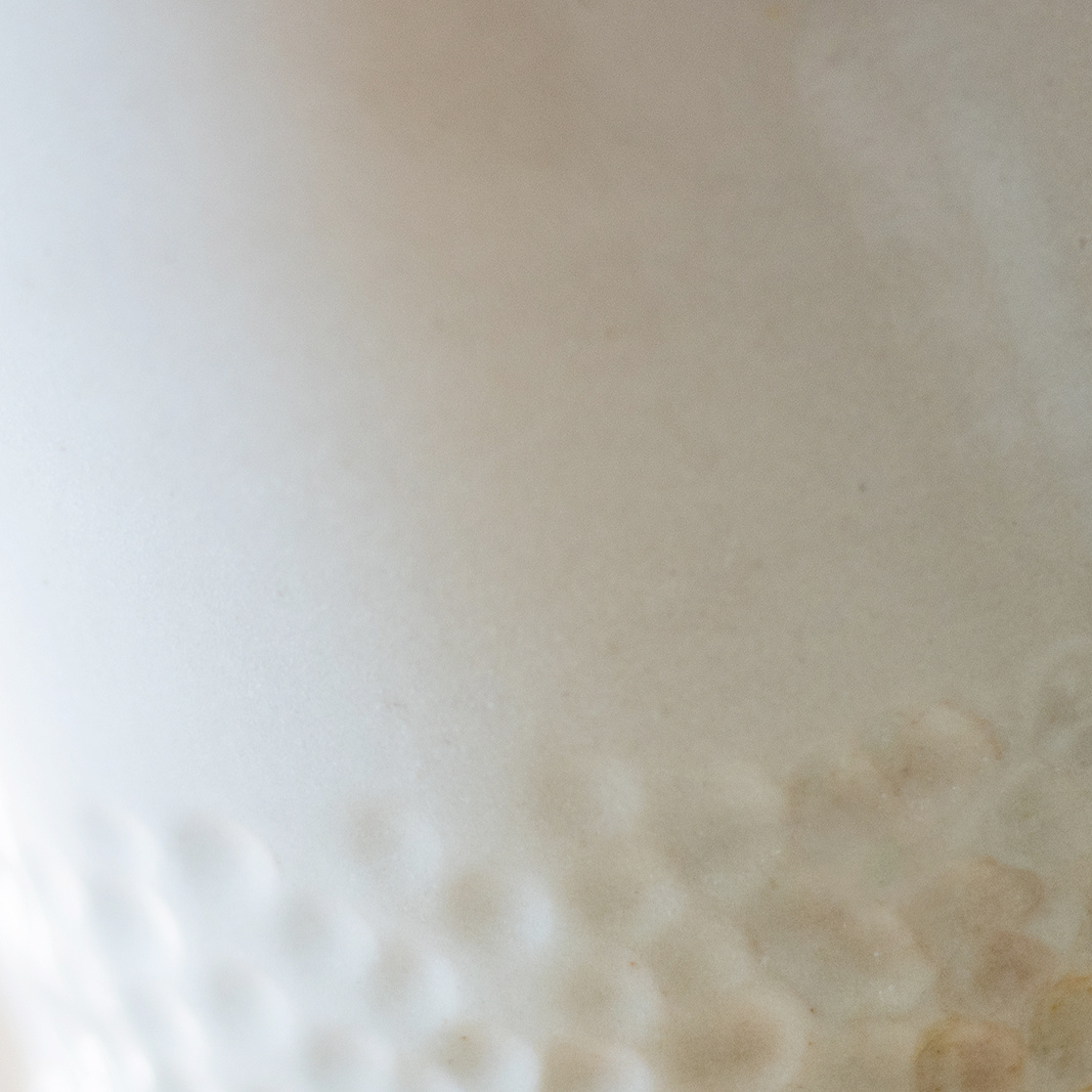 Wykonany ręcznie na kole garncarskim. Masa w kolorze jasnokremowym. W całości pokryty białym, błyszczącym szkliwem. Dekorowany ręcznie efektem młotkowania.
