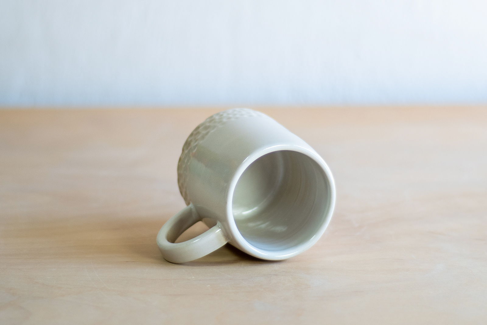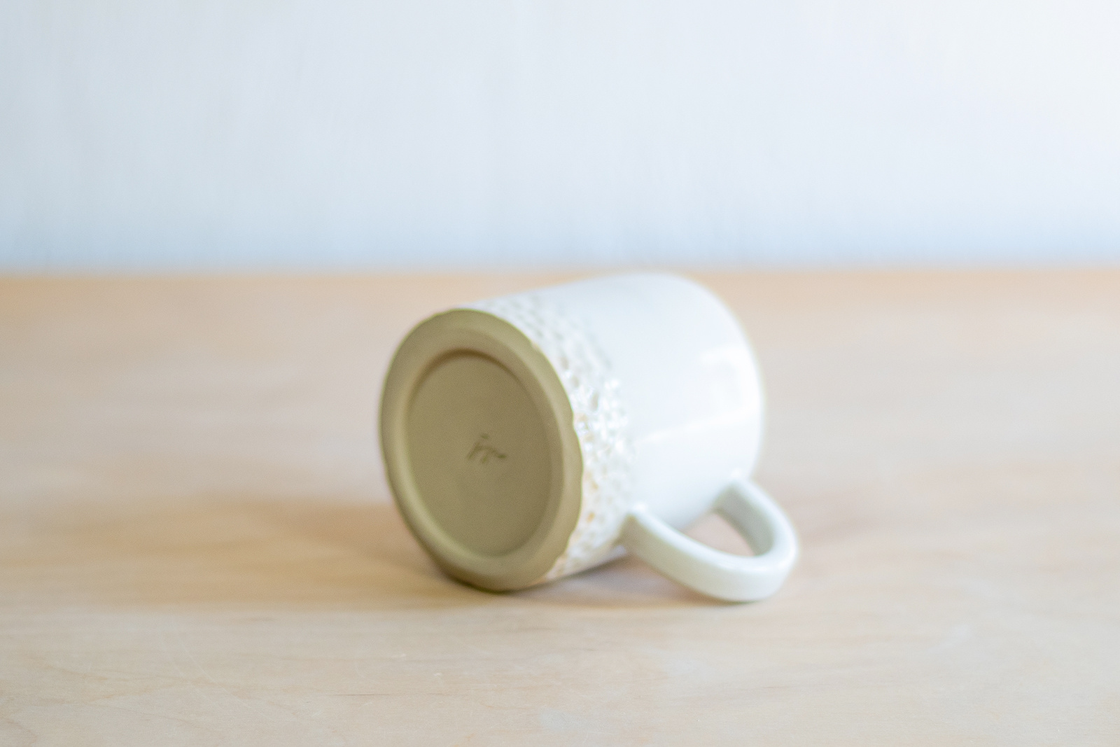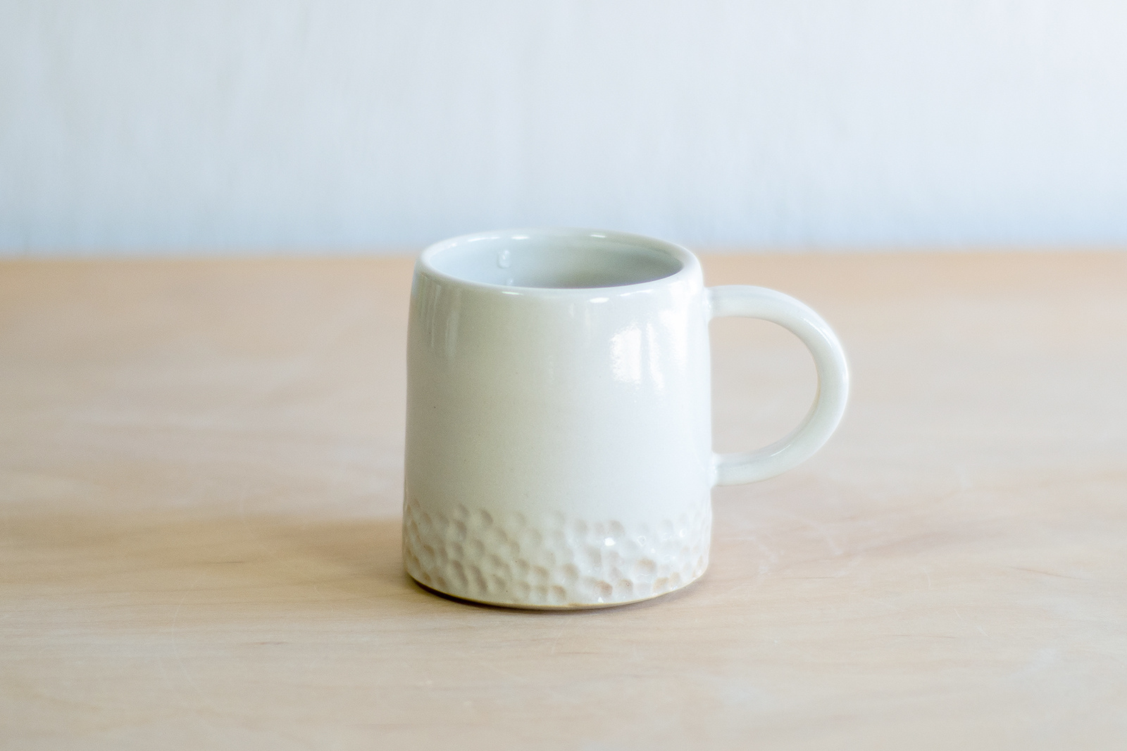 - Kubek ceramiczny o pojemności 200 ml. Wykonany ręcznie na kole garncarskim. Masa w kolorze jasnokremowym. W całości pokryty białym, błyszczącym szkliwem. Dekorowany ręcznie efektem młotkowania.