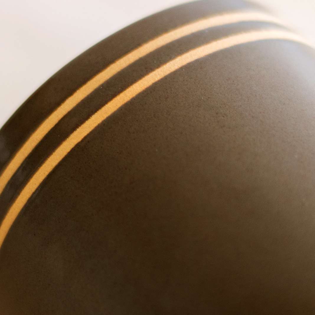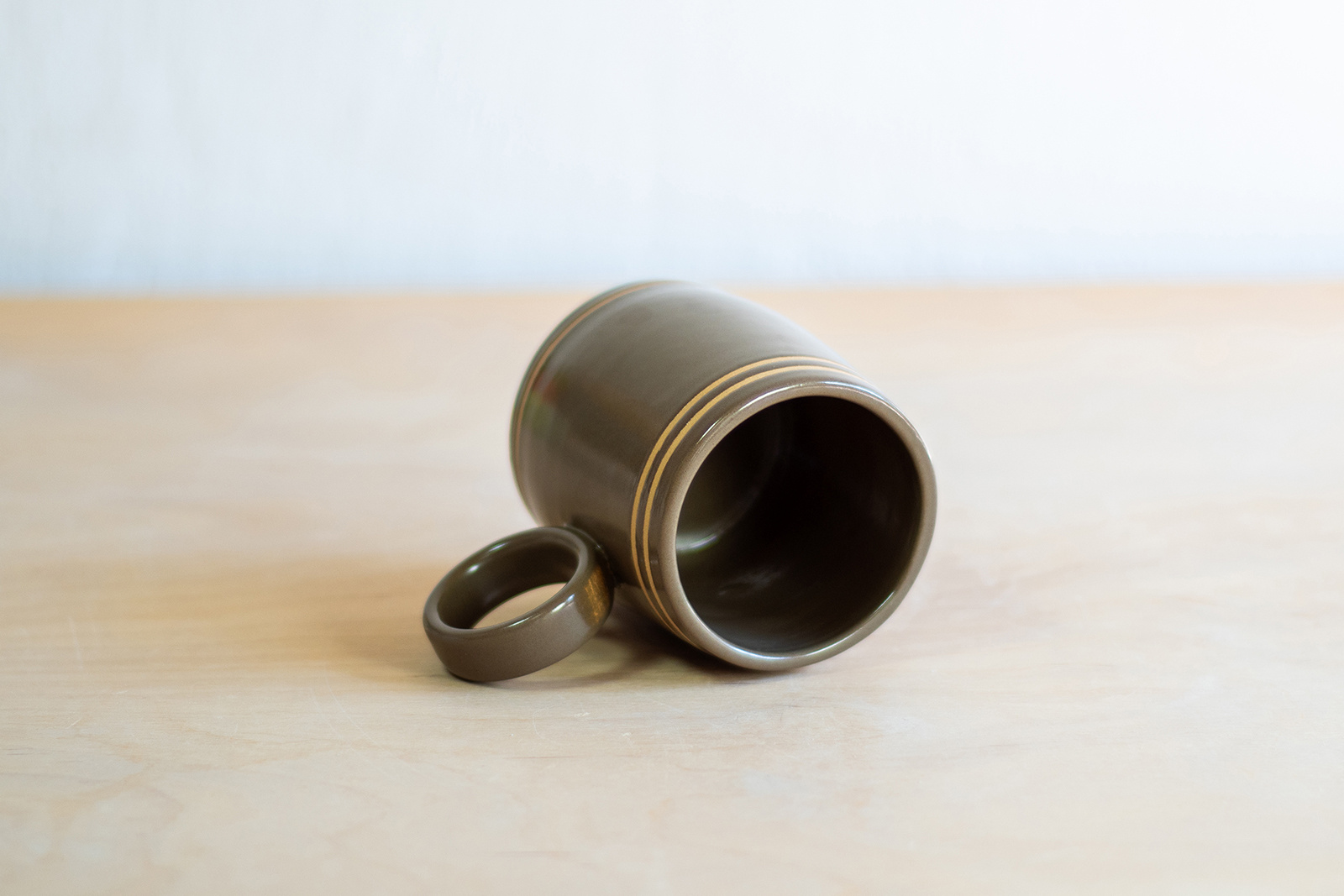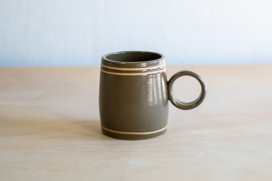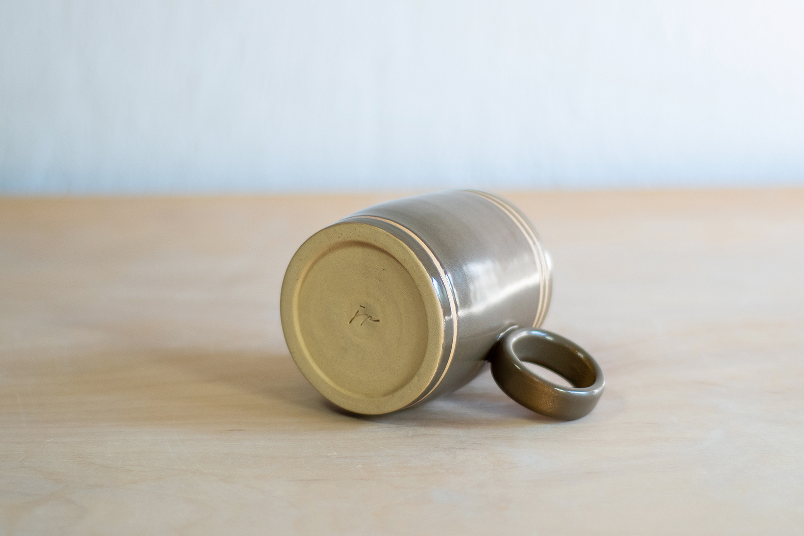 - Kubek ceramiczny o pojemności 250 ml. Wykonany ręcznie na kole garncarskim. Masa w kolorze jasnokremowym. W całości pokryty matowym szkliwem o zgniłozielonej barwie. Dekorowany efektownymi paseczkami.