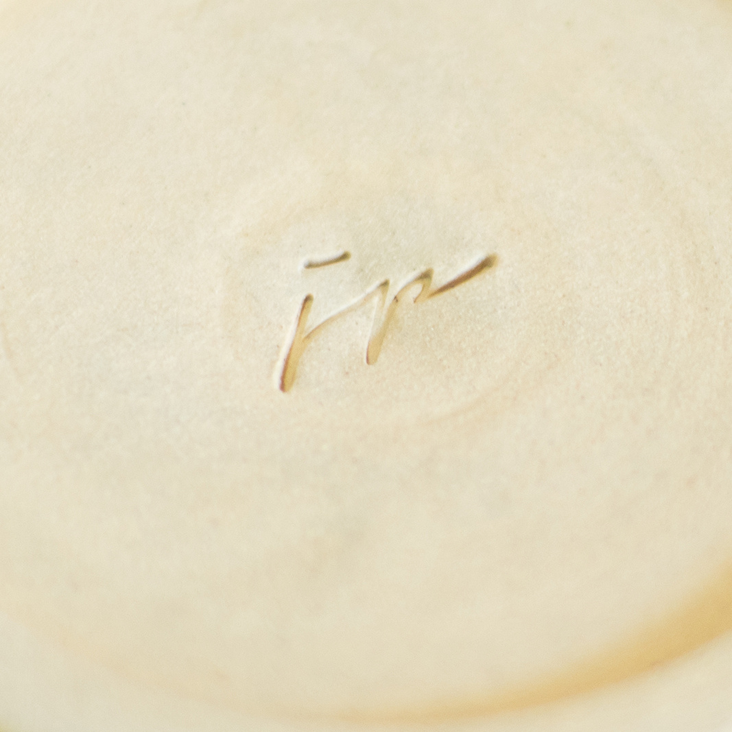 Wykonany ręcznie na kole garncarskim. Masa w kolorze jasnokremowym. W całości pokryty matowym szkliwem o zgniłozielonej barwie. Dekorowany efektownymi paseczkami.Stemplowany logo autorki.