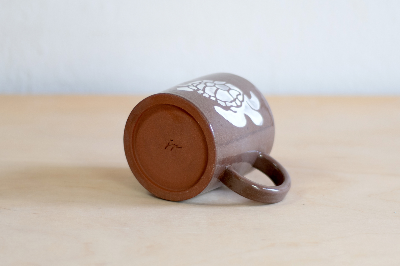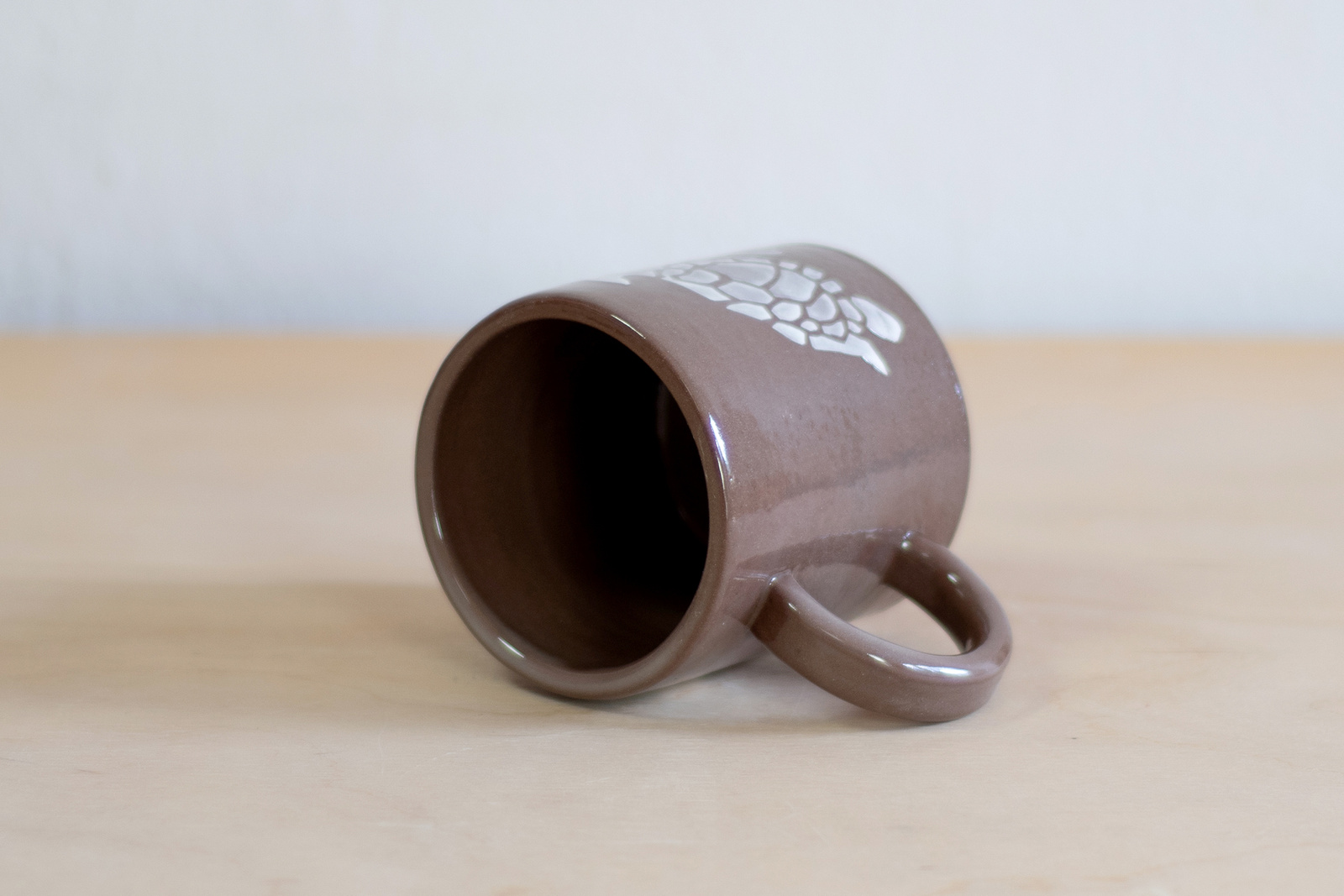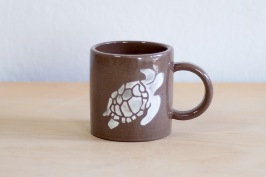 - Kubek ceramiczny o pojemności 200 ml. Wykonany ręcznie na kole garncarskim. Masa w kolorze ciemnobrązowym. Dekorowany białymi sylwetkami żółwików.
