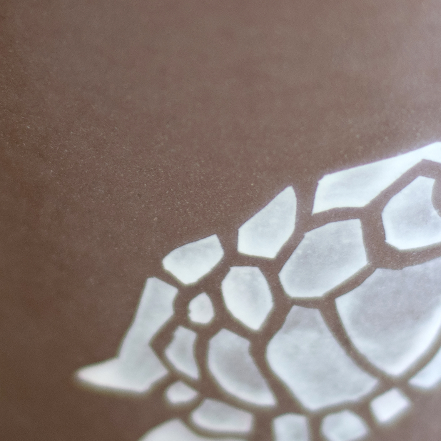 Wykonany ręcznie na kole garncarskim. Masa w kolorze brązowym, dekorowana wycinanką z motywem żółwików. Szkliwiony błyszczącym, transparentnym szkliwem. Stemplowany logo autorki.
