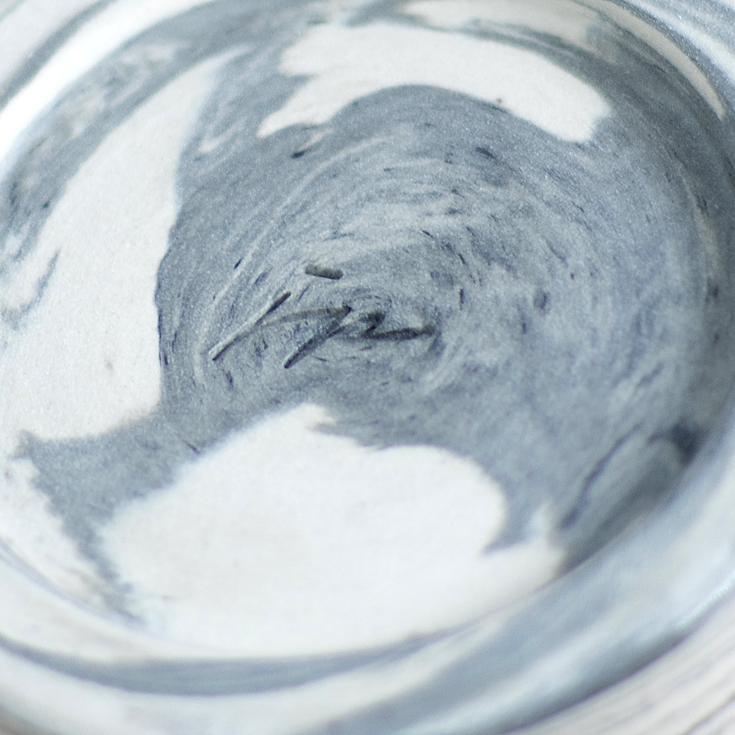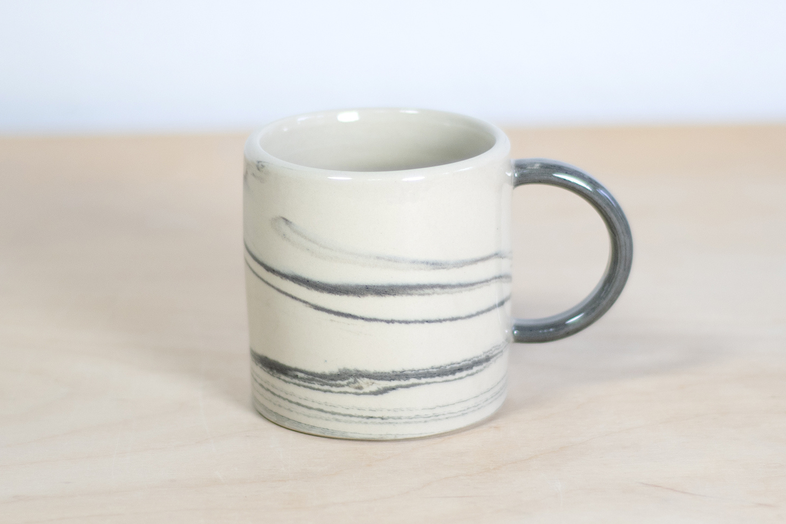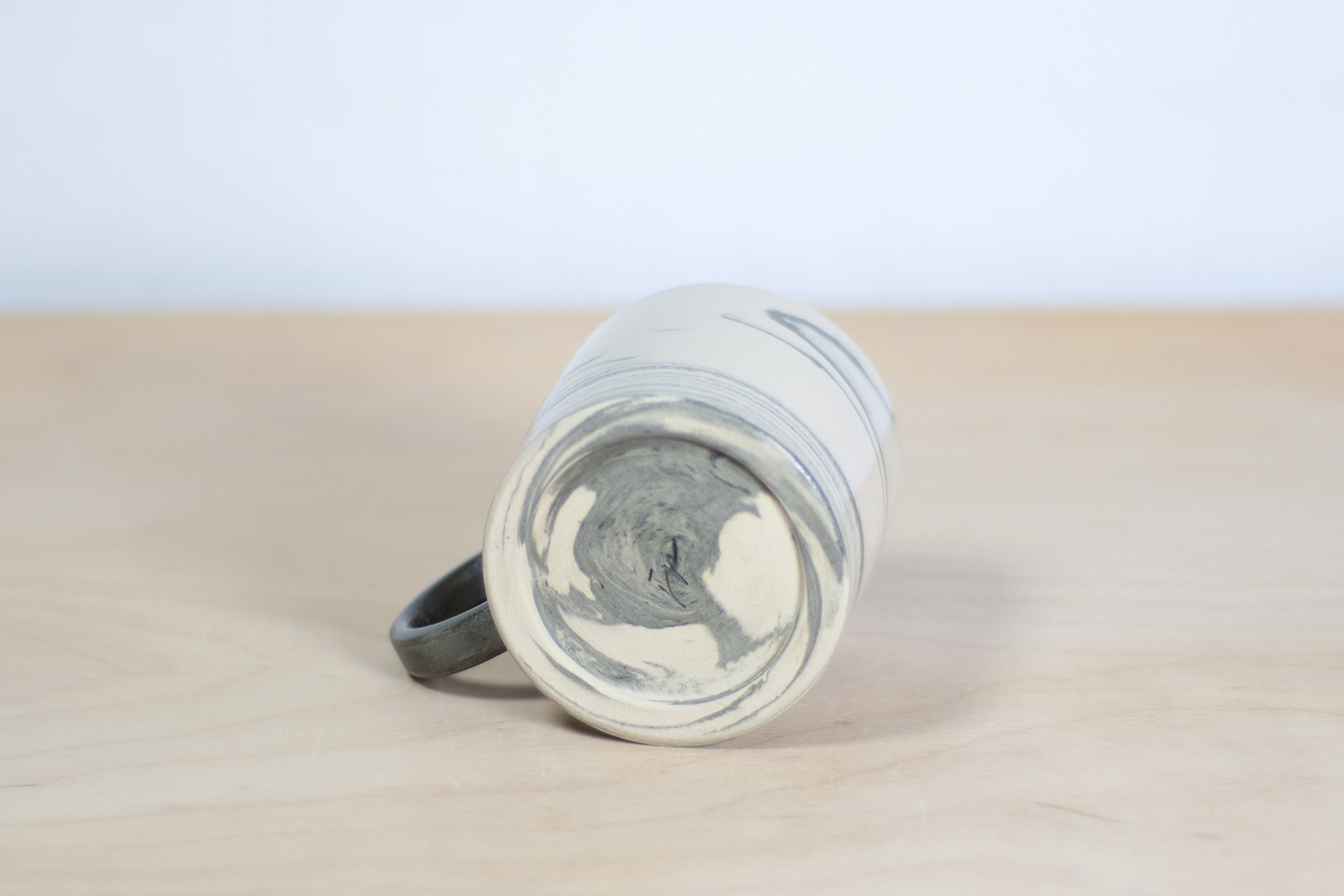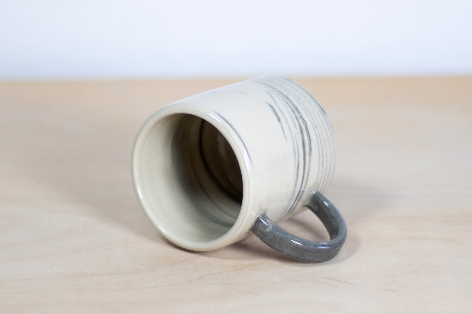 - Kubek ceramiczny o pojemności 150 ml. Wykonany ręcznie na kole garncarskim. Masa w kolorze białym z dodatkiem czarnej masy, tworzącej efektowne przejścia tonalne. Szkliwiony błyszczącym, transparentnym szkliwem.